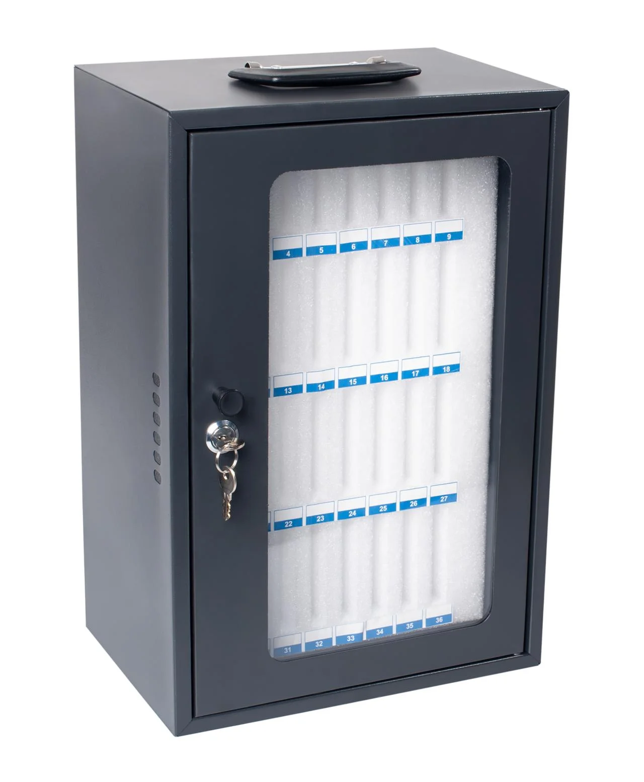 Oppbevar opptil 36 telefoner trygt og organisert. Skumrom som beskytter enhetene mot riper. Nøkkellås for sikker lagring og veggmontering for plassbesparelse.