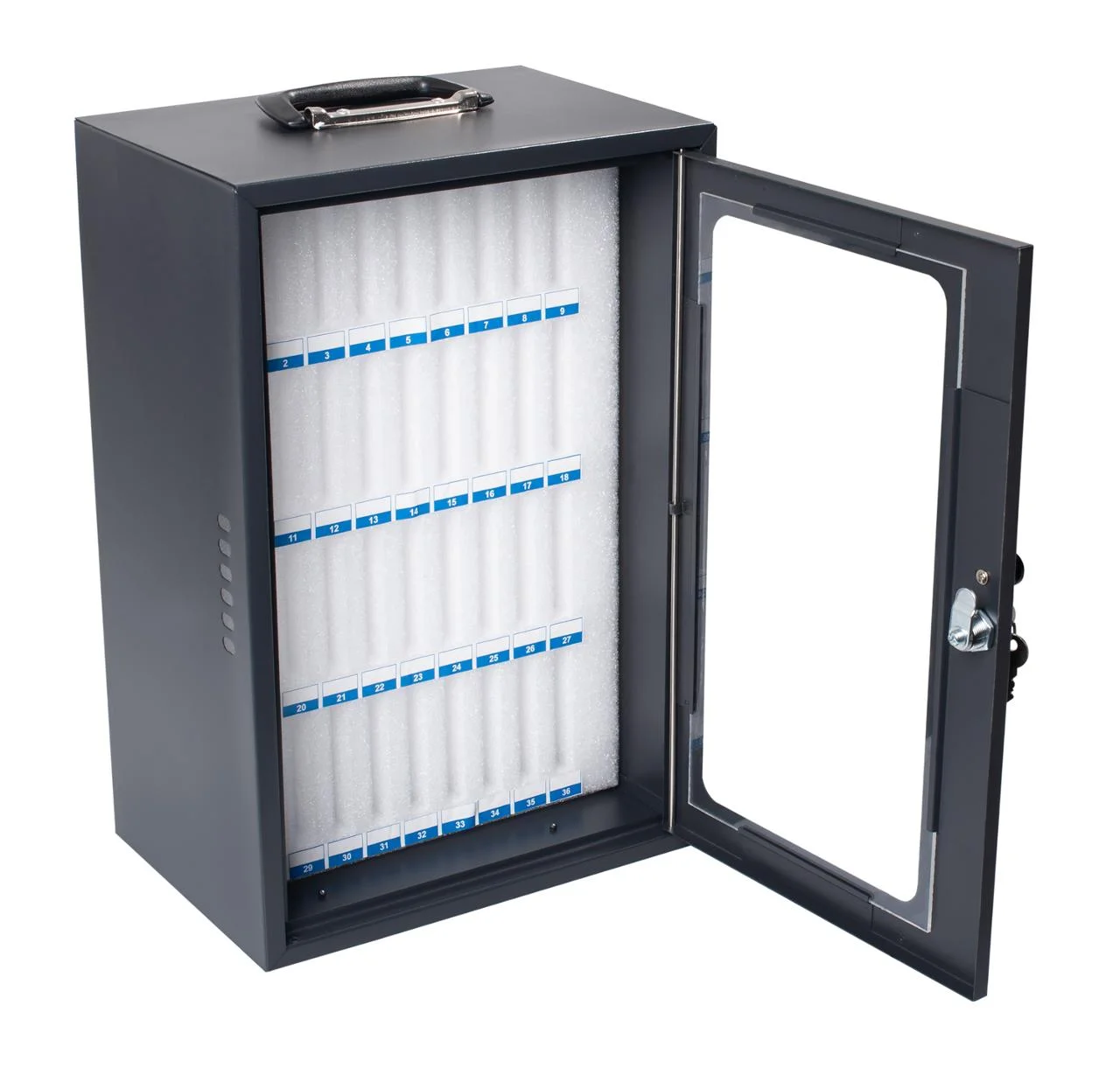PAVO mobiloppbevaring er den perfekte løsningen for organisasjoner som ønsker trygg og oversiktlig lagring av opptil 36 telefoner. Laget av stål med akryldør og utstyrt med myke skumrom for å beskytte mot riper. Med nøkkellås, bærbarhet og mulighet for veggmontering passer denne til skoler, klinikker og idrettsklubber.