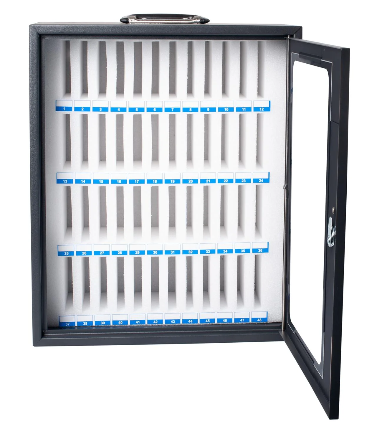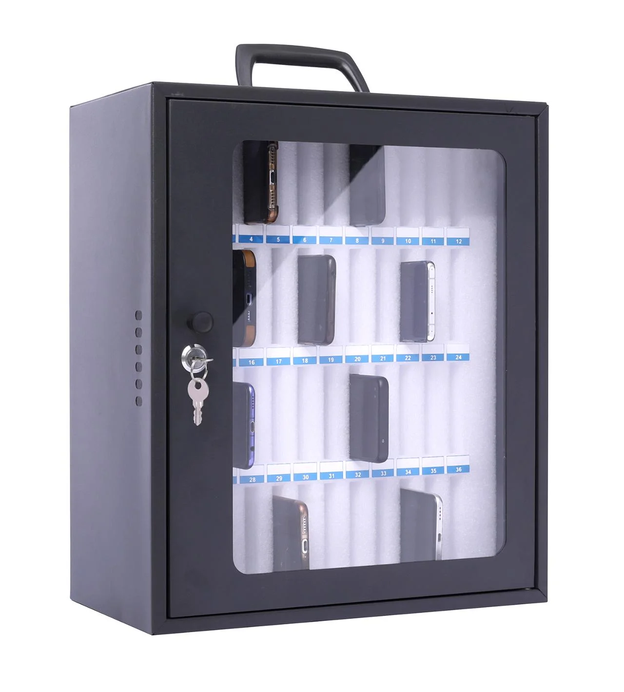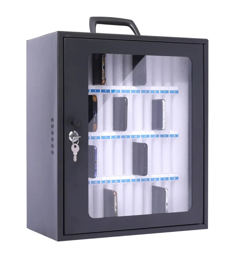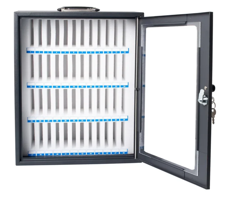 Oppbevar opptil 48 telefoner trygt og organisert. Skumrom som beskytter enhetene mot riper. Nøkkellås for sikker lagring og veggmontering for plassbesparelse.