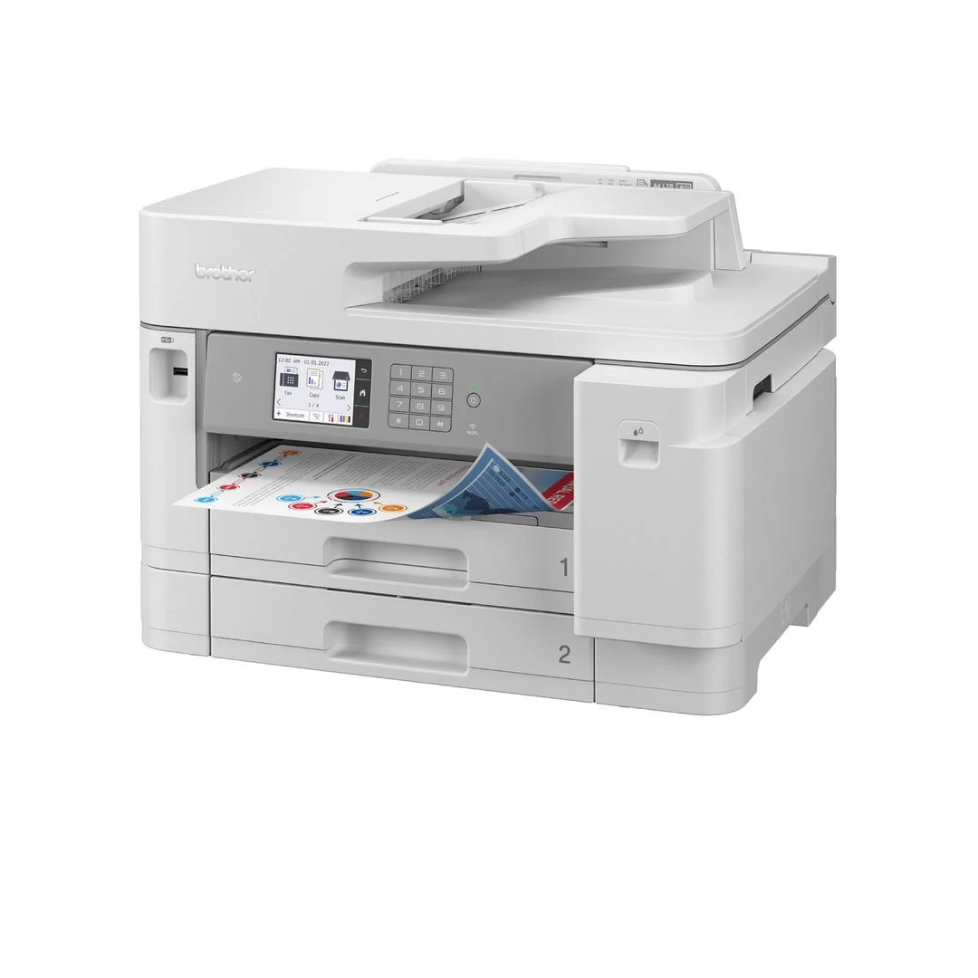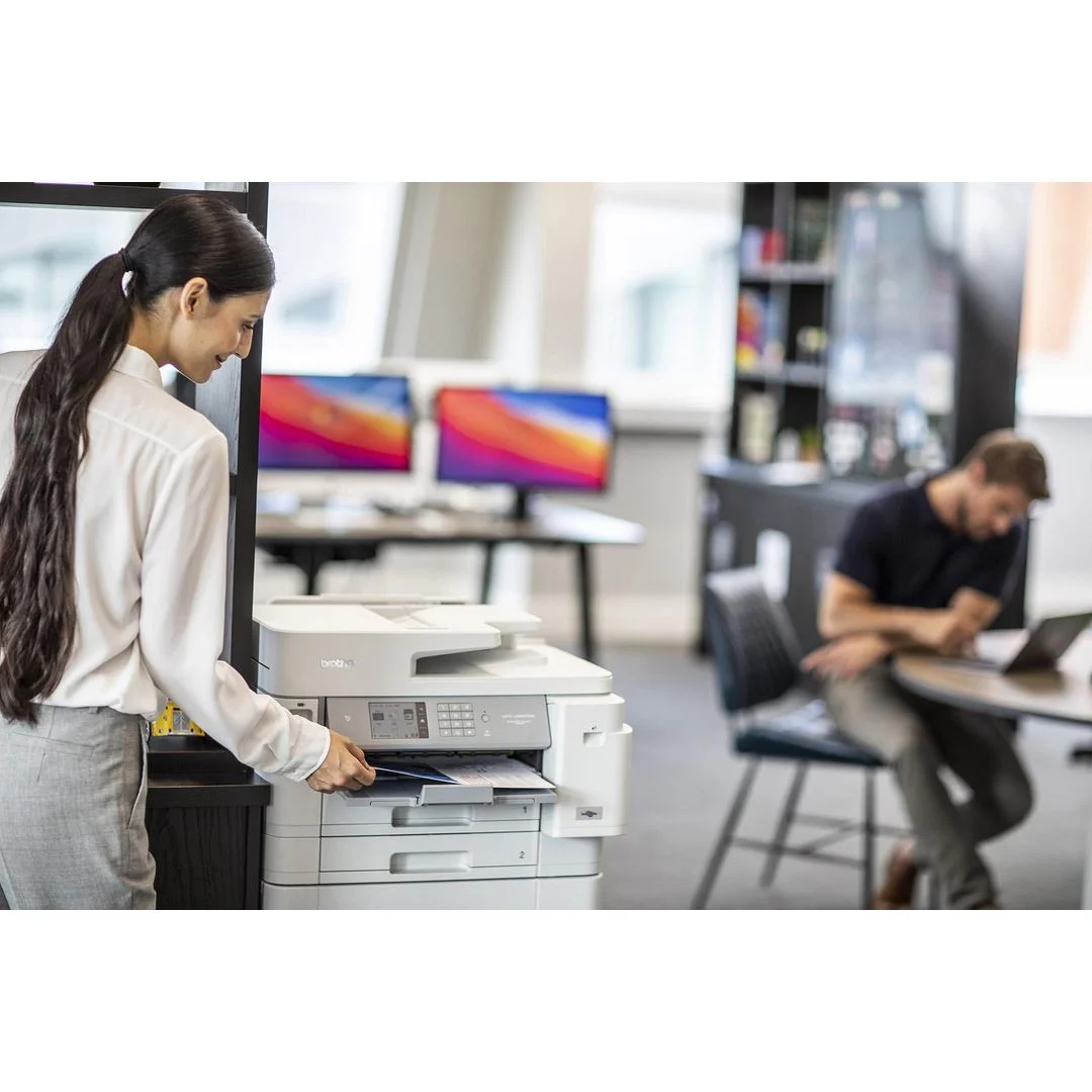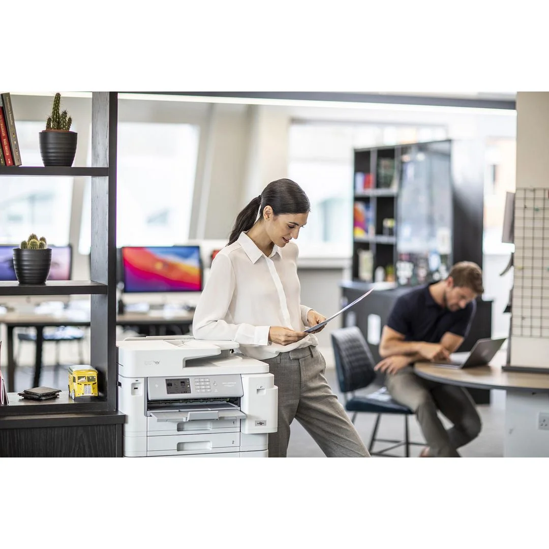 Skriveren produserer dokumenter i høy kvalitet med MAXIDRIVE skrivehodeteknologi og har kablet og trådløst nettverkstilkobling, mobil tilkobling med appen Brother Mobile Connect og Near-Field Communication (NFC) for sikker autentisering, mobil utskrift og skanning. Den første siden skrives ut på under 5 sekunder og utskriftshastigheten er på opptil 30 ipm i sort-hvitt og farger med MAXIDRIVE skrivehodeteknologi Skriveren har stor papirkapasitet på 2 x 250 ark, 50 arks tosidig A4 automatisk dokumentmater (ADF), automatisk tosidig A4 utskrift, kopi, skann og faks og 8,8 cm farge berøringsskjerm Sammen med lavt strømforbruk er denne skriveren ideell for travle kontorer og arbeidsgrupper som er ute etter et mer miljøvennlig utskriftsalternativ Som tilbehør finnes XL høykapasitet blekkpatroner for utskrift av opptil 6000 sider i sort-hvitt og 5000 sider i farger Skriveren er miljømerket nordiske Svanen og Blue Angel.