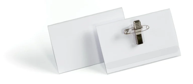 Fleksibelt navneskilt for engangsbruk Navneskilt med kombinasjonsklips kan festes med nål eller klipses på klærne. Praktisk løsning for store arrangementer og konferanser der navneskilt ofte ikke blir levert tilbake. Skiltet har tommelgrep for enkel utskifting av innstikk. – Format: 54 x 90 mm – – Kombinasjonsklips: nål eller klips – – Tommelgrep for enkel etikettutskifting – – Antall per pakke: 50 stk –