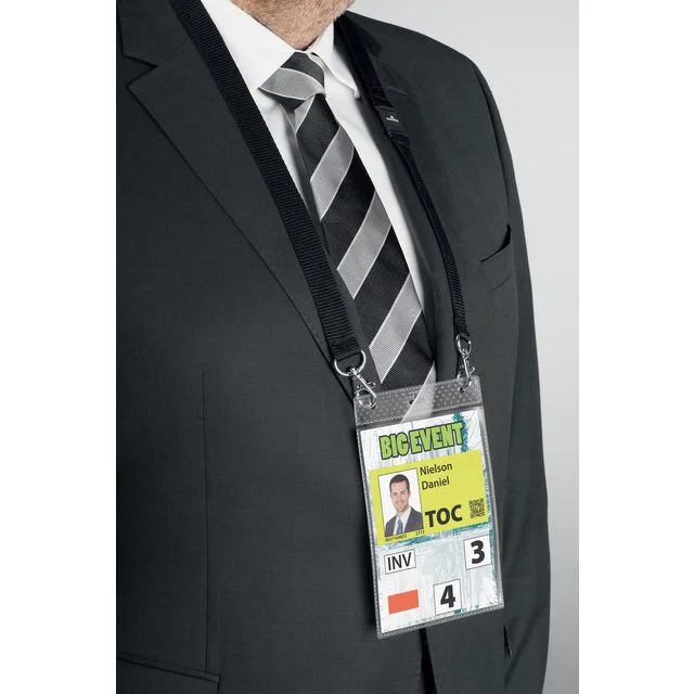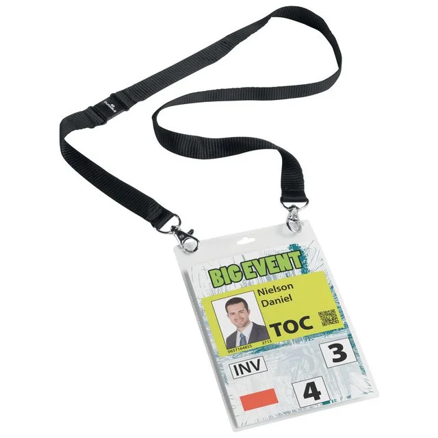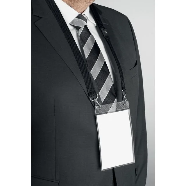 Kombinert med en tekstilbånd som er 2 cm bred med sikkerhetsåpning og to karabinkroker. Doble karabinkroker gjør at skiltet ikke tvinner seg Kan brukes med 1420 A6 – format (stående format).