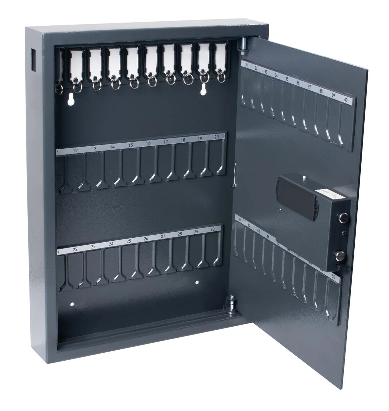 Slitesterkt nøkkelskap med sikkerhetslåsesystem og magnetiske nøkkeltagger. Et robust stålkabinett med mørk grå matt finish, ideelt for sikker oppbevaring av nøkler. Dette nøkkelskapet inkluderer 10 magnetiske nøkkeltagger og er utstyrt med et sikkerhetslåsesystem for ekstra beskyttelse. Det følger med to reserve nøkler for enkel tilgang, samt en praktisk nøkkelreturåpning. Perfekt for organisering og sikkerhet i både hjem og kontor.