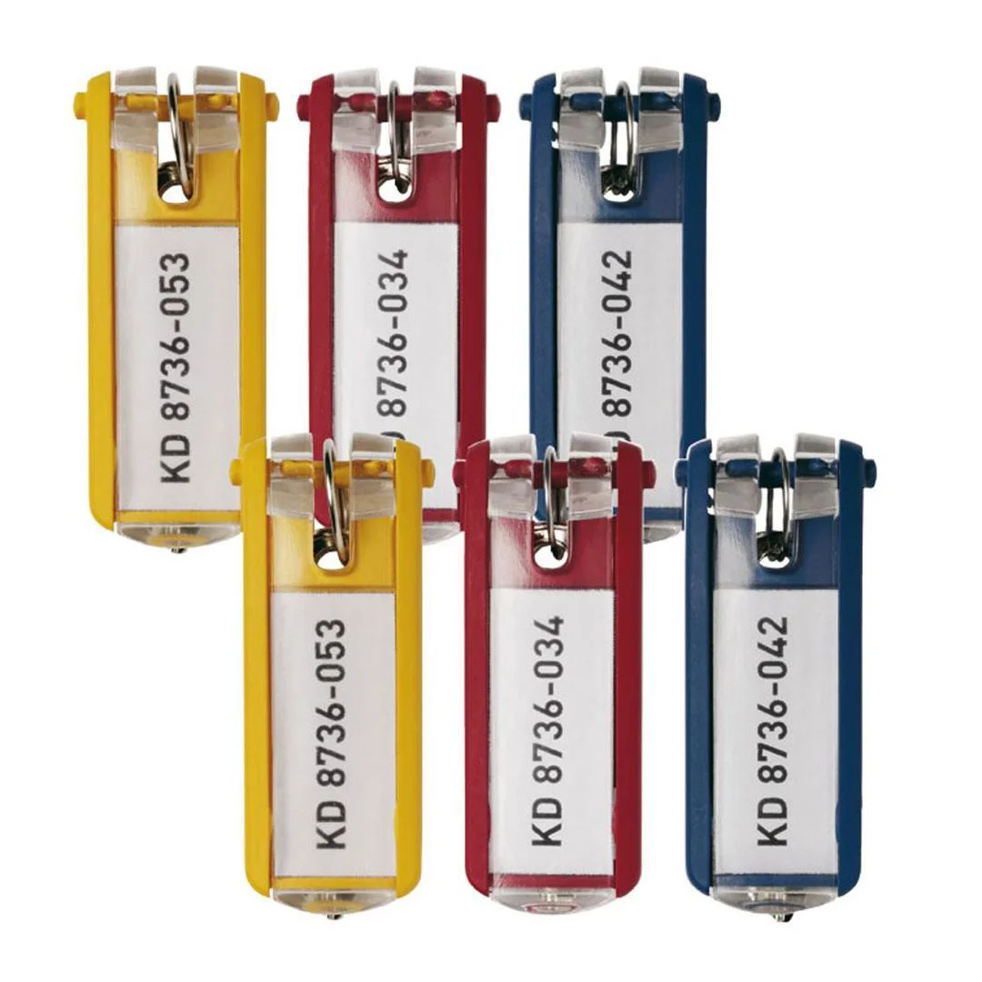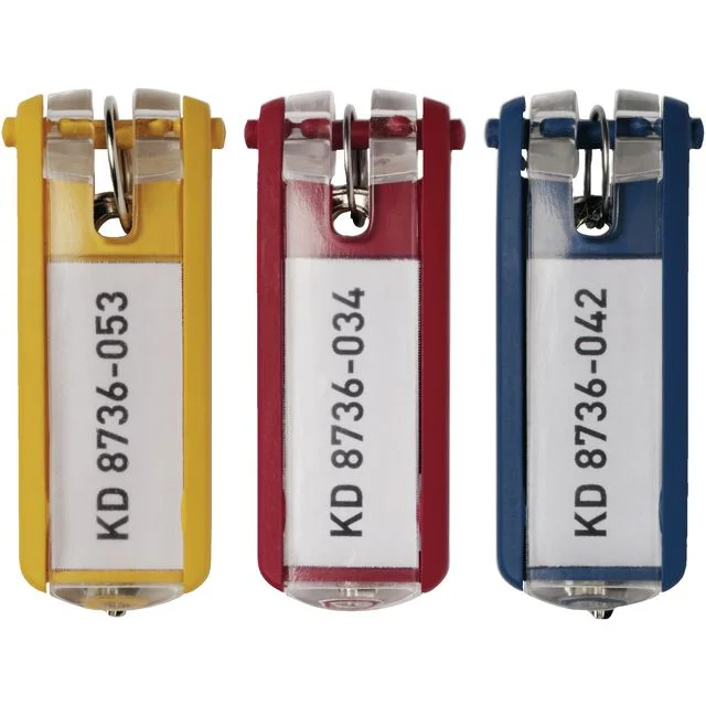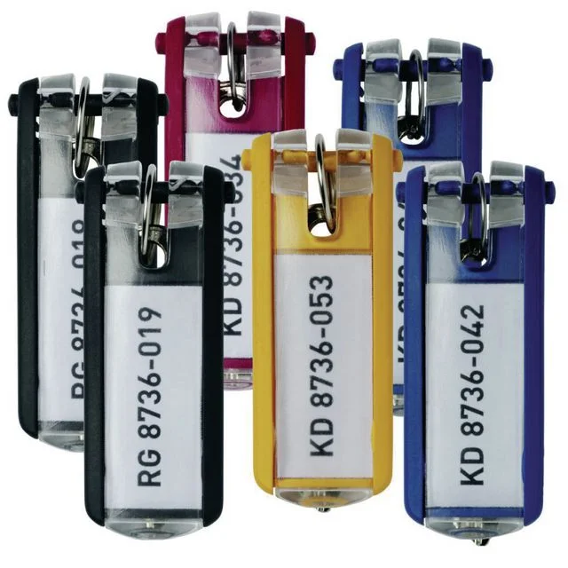 Det er seks deler i pakningen – to sorte, to blå, én rød og én gul nøkkelring. Velegnet til administrering av nøkler for mange skuffer eller skap Lett å åpne og legge inn papirstrimler.