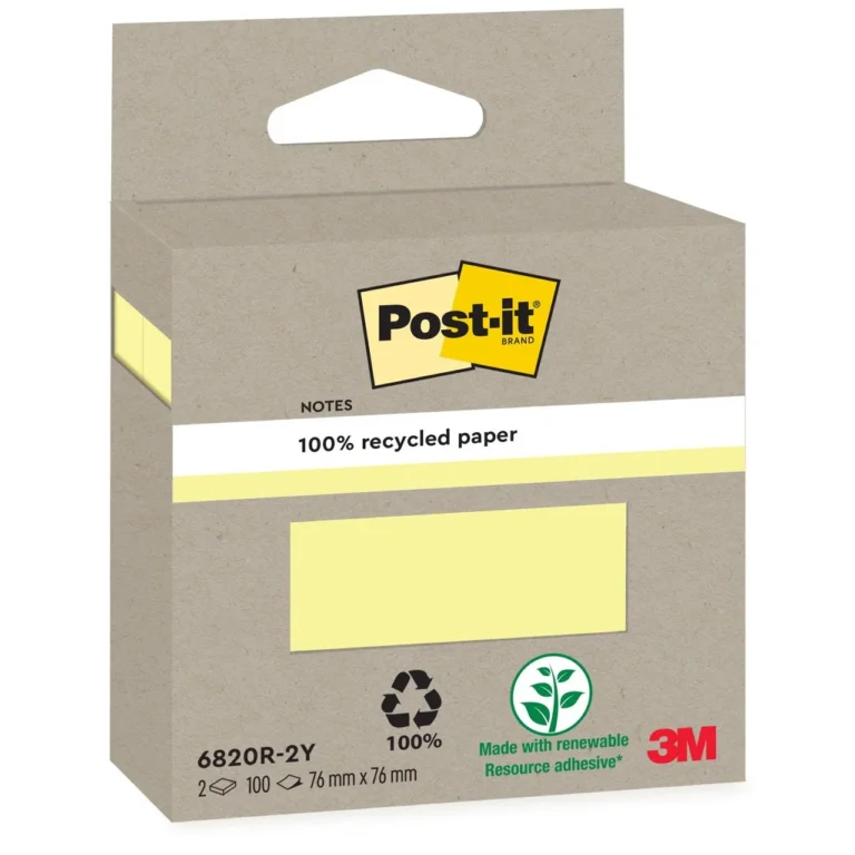 Post-it® Recycled Notes er laget av 100% resirkulert papir og et fornybart klebestoff, 60% laget av planter som vokser opp igjen årlig.