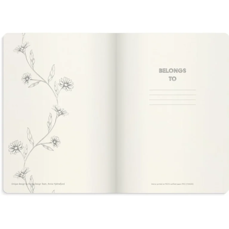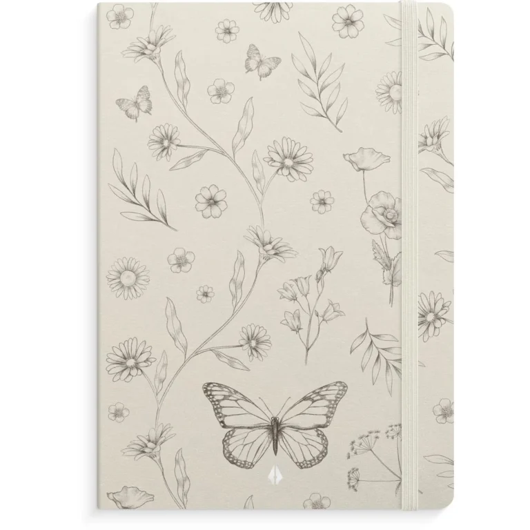 Eksklusiv linjert notatbok i praktisk format. Samle ideene, drømmene og notatene dine i en eksklusiv notatbok! Notebook Deluxe butterfly har et mykt omslag i kunstlær med trendy blomstermønster. Denne innbundne notatboken ligger flatt når den er åpen. Innmaten består av 160 kremfargede linjerte sider som venter på å bli fylt med dine notater. Boken lukkes med et praktisk gummibånd, og bakerst er det en lomme for kvitteringer og små notater.