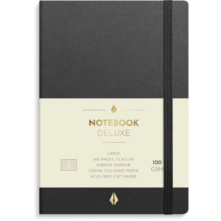 Notatboken er innbundet med et mykt omslag i kunstlær og har et praktisk strikkbånd som holder boken lukket.nMed 160 kremfargede linjerte sider på 100g papir ligger boken flatt når den er åpen, noe som gir deg en komfortabel skriveopplevelse.nBakerst finner du en smart papirlomme til små notater og kvitteringer, og et innebygd bokmerke sørger for at du alltid kan holde oversikt over hvor du er.
