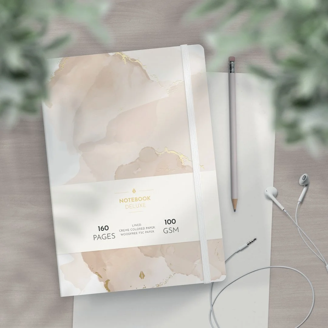Eksklusiv linjert notatbok innbundet i mykt kunstskinnomslag.
