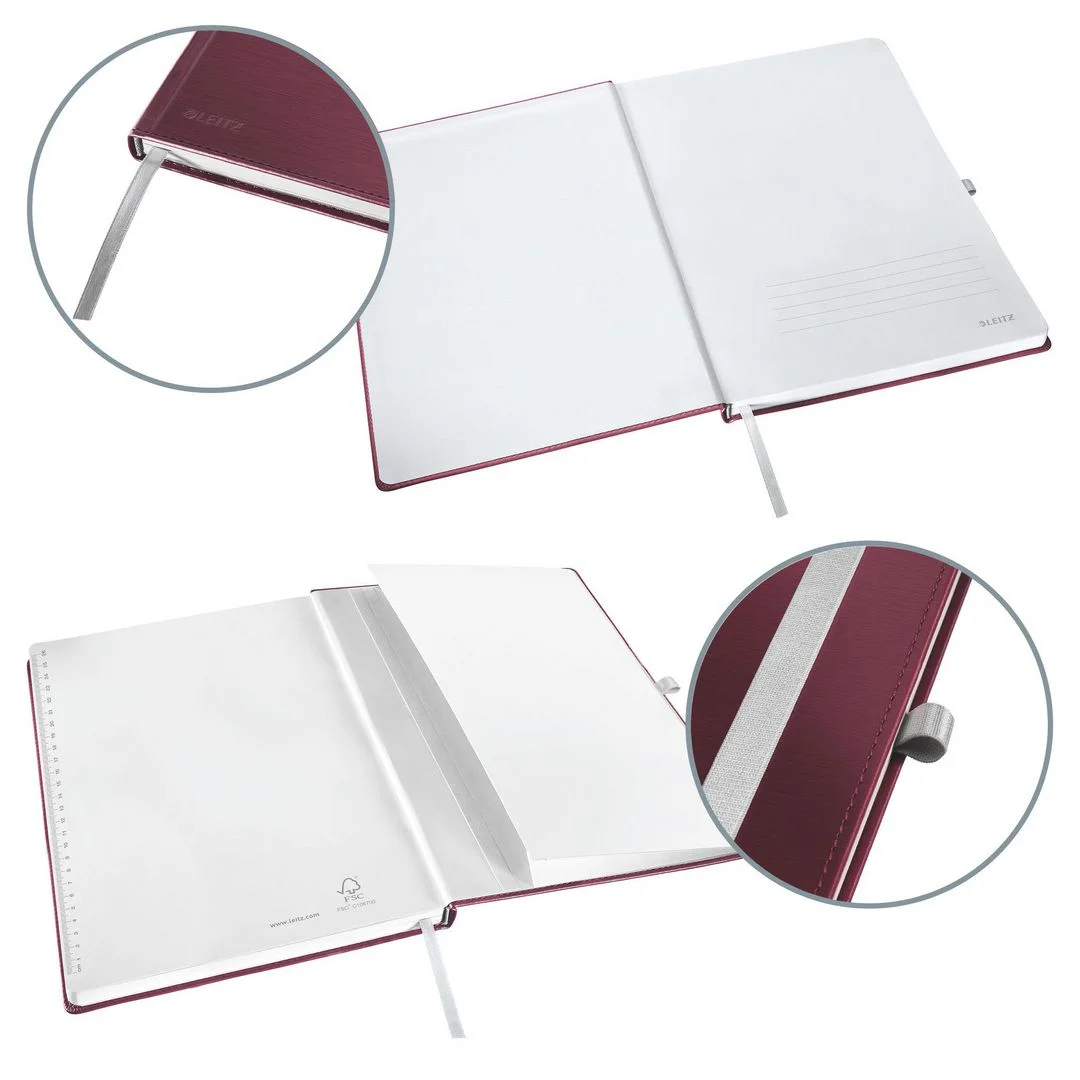 Notatboken har elastisk bånd som holder omslaget lukket, samt en penneholder slik at du alltid er klar til å skrive. Tekstilsidemarkøren hjelper deg raskt å finne og åpne en viktig side og de siste åtte sidene er perforert for enkelt å kunne rive av. Den har også en integrert lomme på innsiden av bakomslaget for rask oppbevaring av løse papirer eller visittkort.