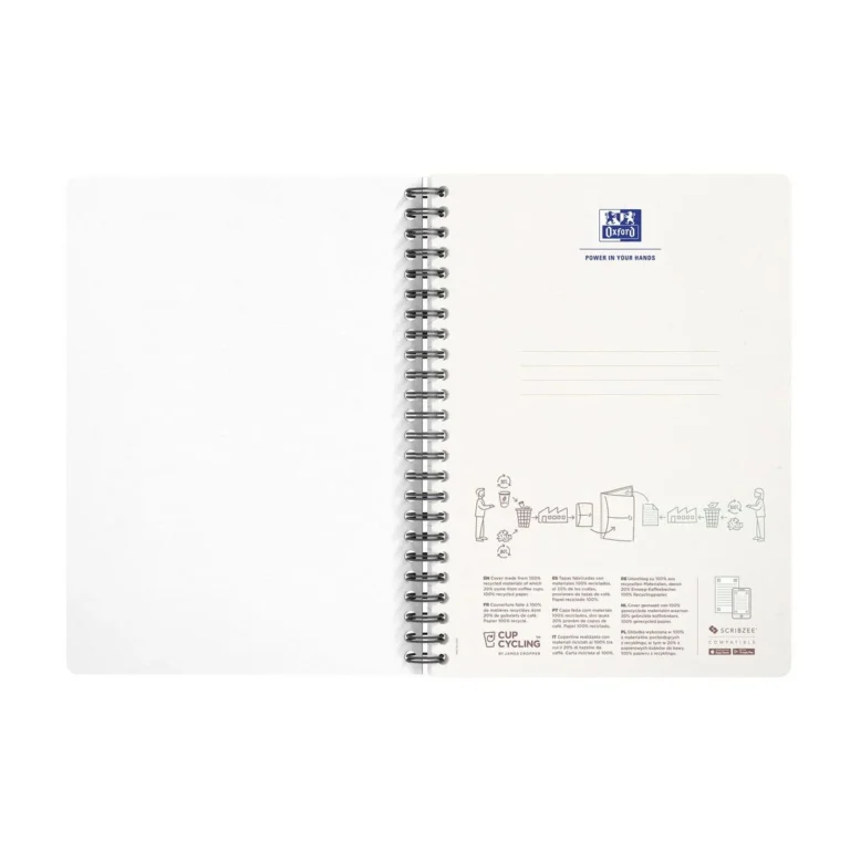 Kartongomslaget er 100% resirkulert laget av fibre hentet fra papirkopper og resirkulert papir. Naturlig hvitt og glatt 100% resirkulert 90 g papir, som gir en komfortabel skriveopplevelse 180 sider SCRIBZEE®-kompatibel Kommer i 6 naturlige farger med matt cover.