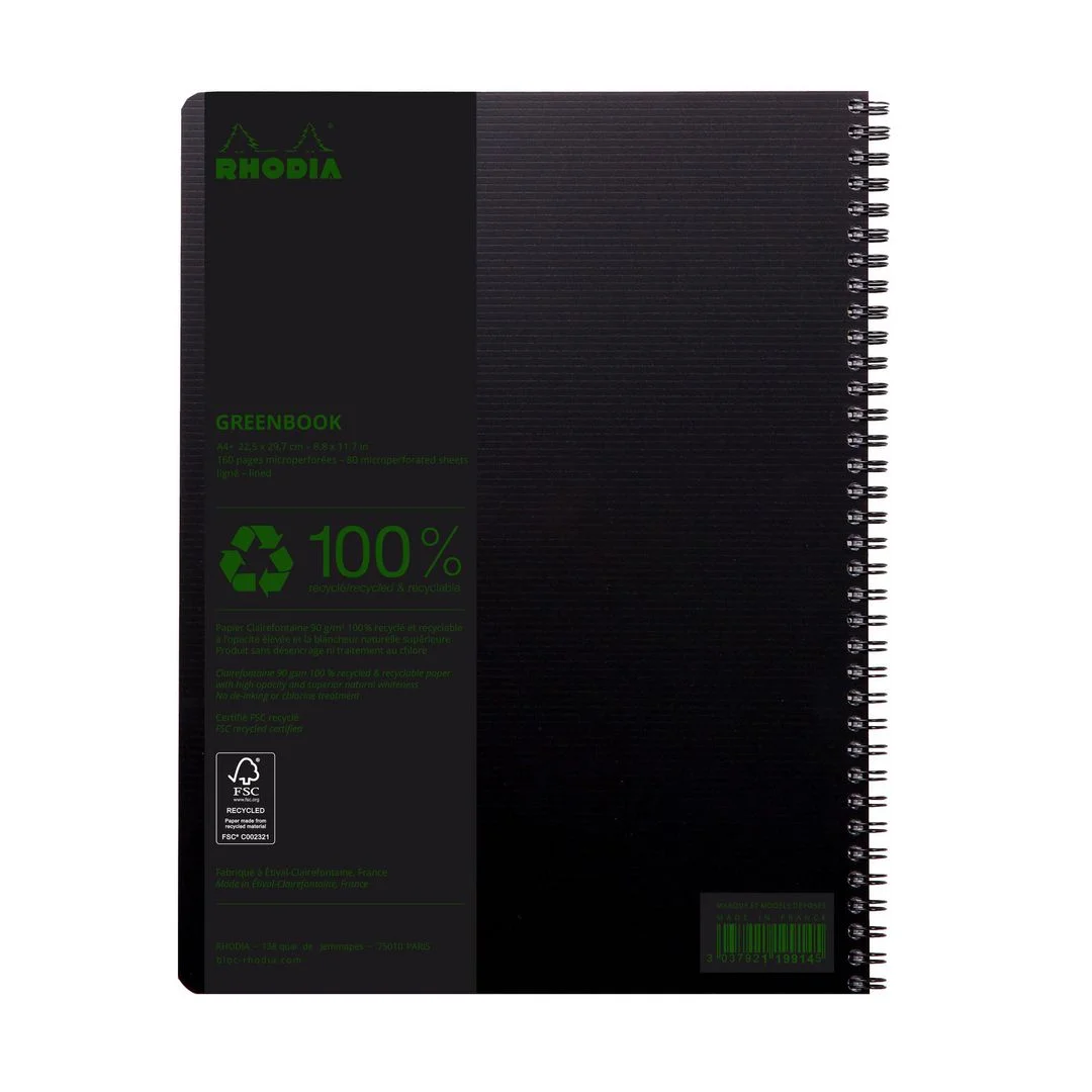 Stilig og miljøvennlig notatbok. Velg en miljøansvarlig notatbok med RHODIA GreenBook A4+. Denne profesjonelle notatboken har et omslag laget av 100% resirkulert og gjenvinnbar polypropylen, samt 160 mikroperforerte og perforerte sider av Clairefontaines bemerkelsesverdige 90 gsm resirkulert papir.