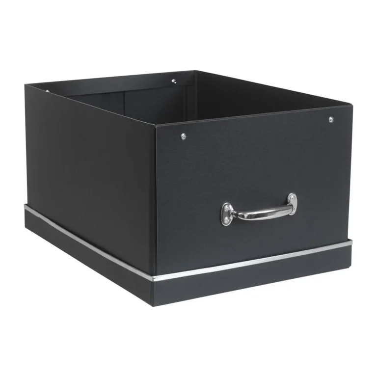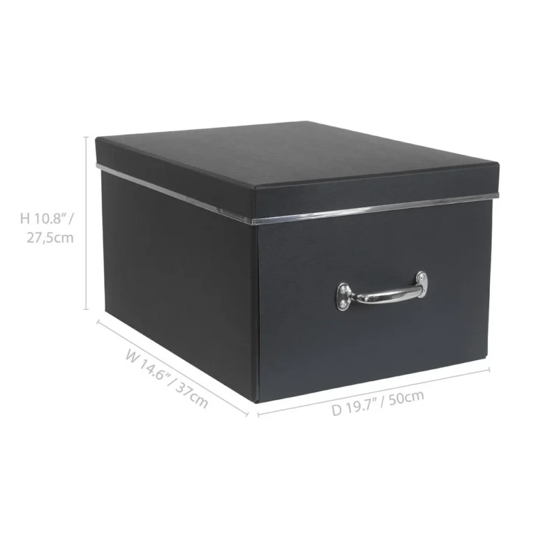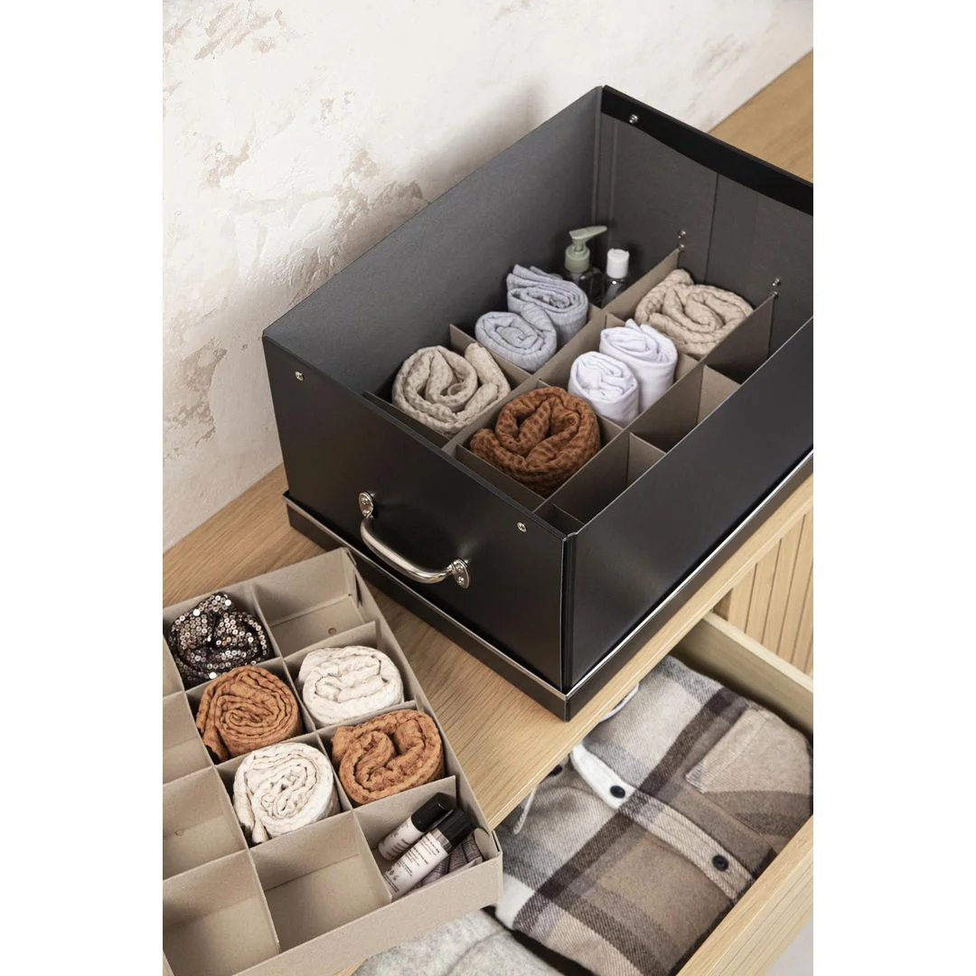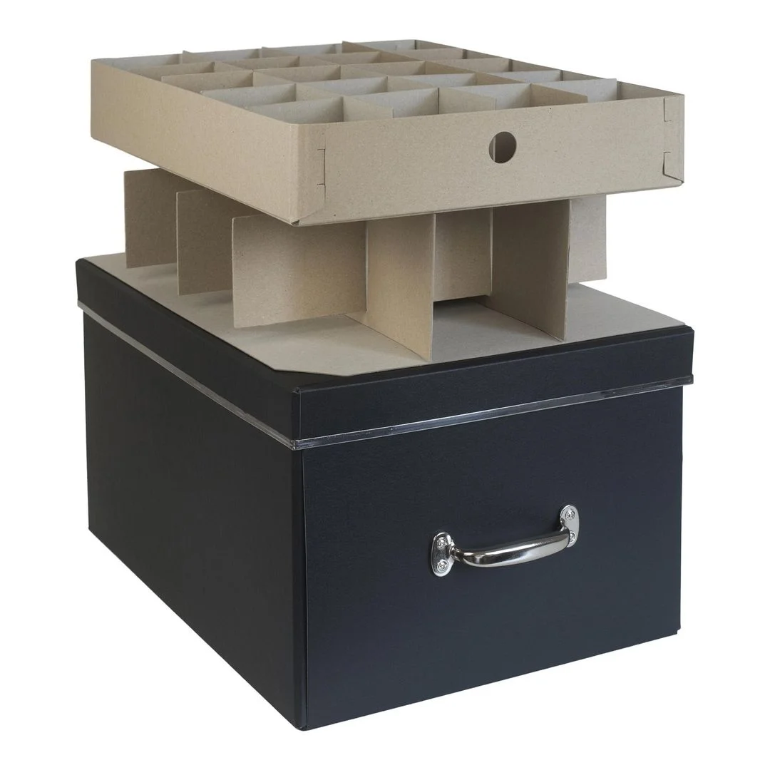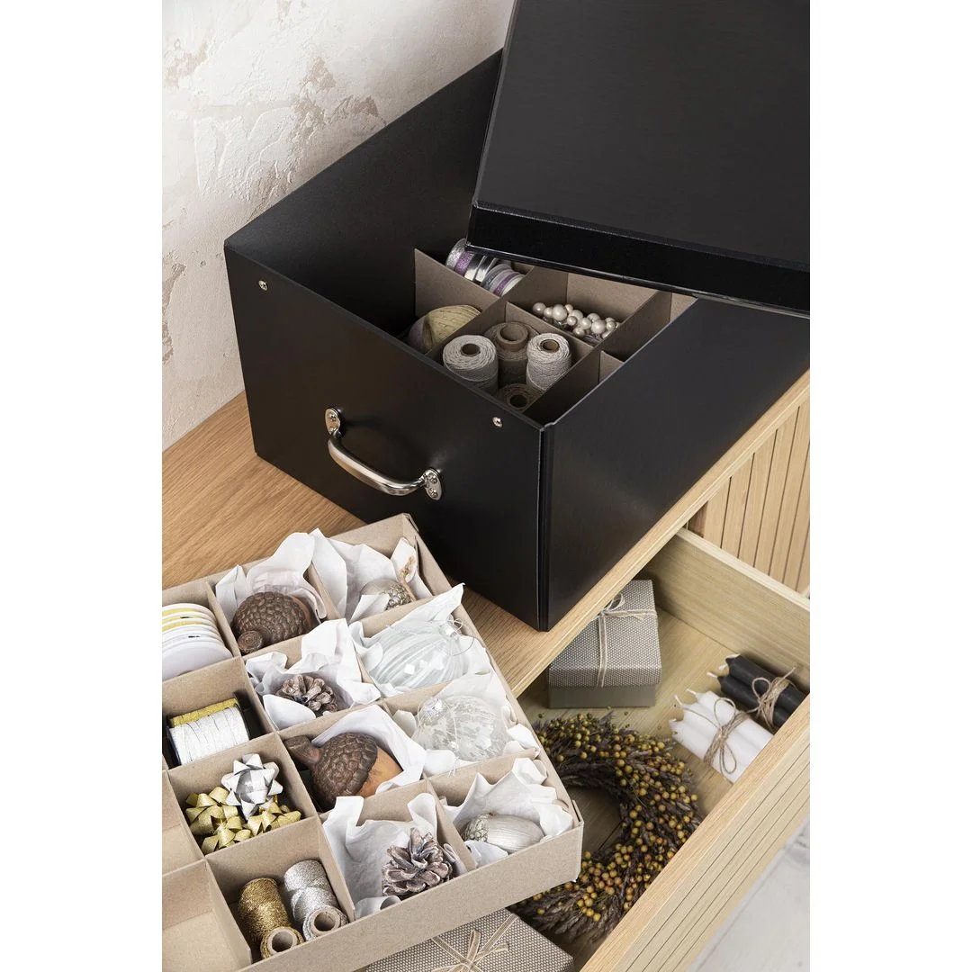Stor oppbevaringsboks for organisering i flere etasjer, og med to varianter av inndeling (12 rom og 20 rom). Leveres med lokk og metallhåndtak, og er enkle å stable på hverandre. Særlig egnet til å oppbevare julekuler og annen julepynt. Leveres flatpakket, og er enkel å montere uten verktøy. – Mål (LxBxH): 50x37x27,5 cm – Farge: sort