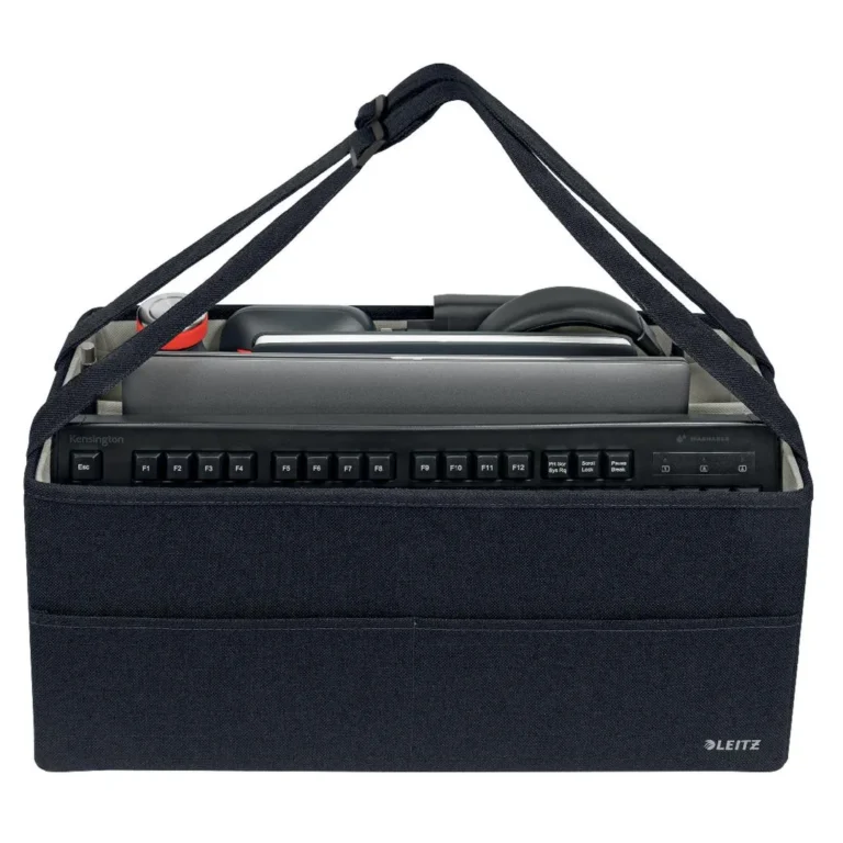 Leitz Fabric oppbevaringsveske Clean Desk Sammenleggbar oppbevaringsveske som er ideell for å holde orden på kontoret, hjemme, jobbe hybrid eller på skolen, også ideell som lærerveske Har 3 rom for å holde innholdet organisert med en sentral seksjon for oppbevaring av en bærbar PC.