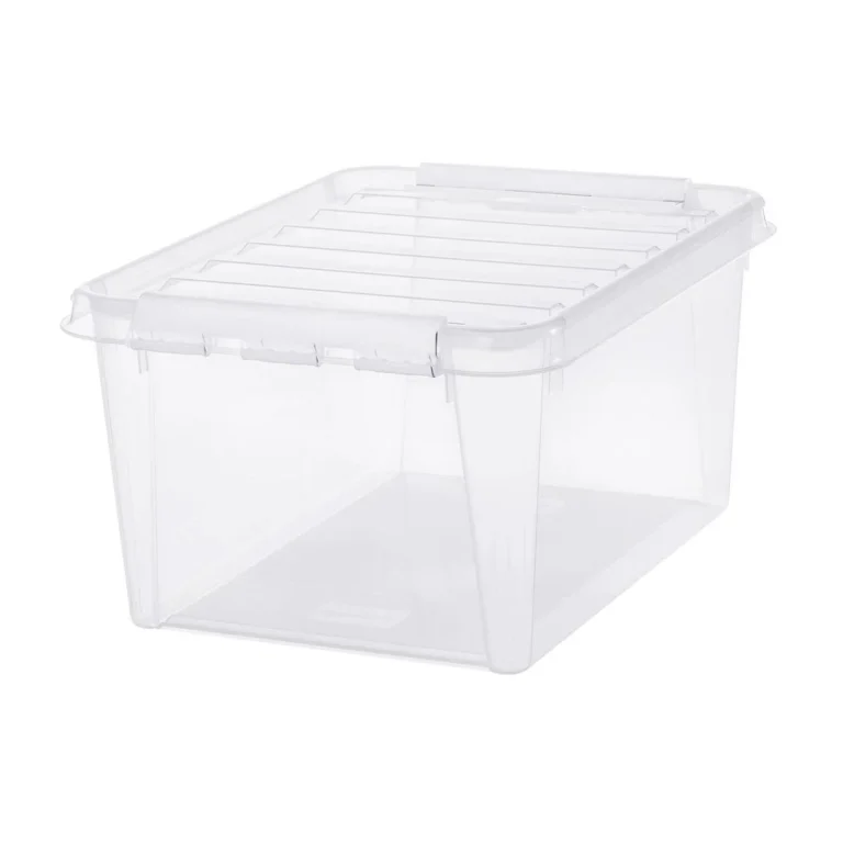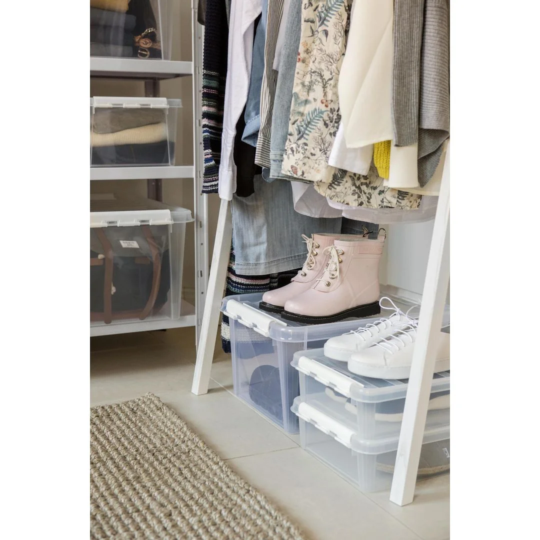Romslig oppbevaringsboks til lagring i gang eller bod. Passer godt til oppbevaring av for eksempel puter, tepper, sko eller klær. Boksene kan stables i hverandre uten lokk og oppe på hverandre med lokk. Klipsen på sidene sikkerstiller at lokket sitter godt fast.