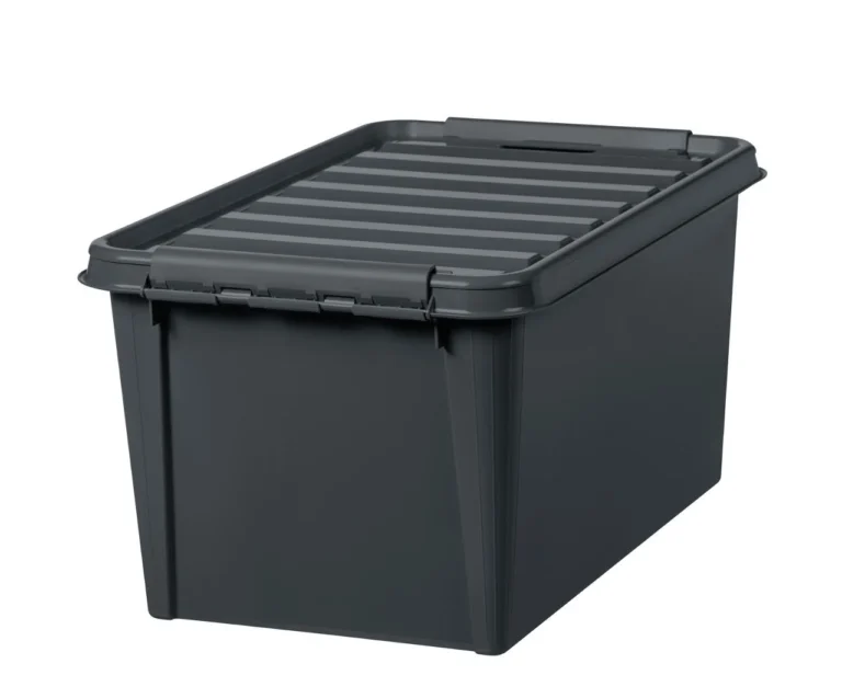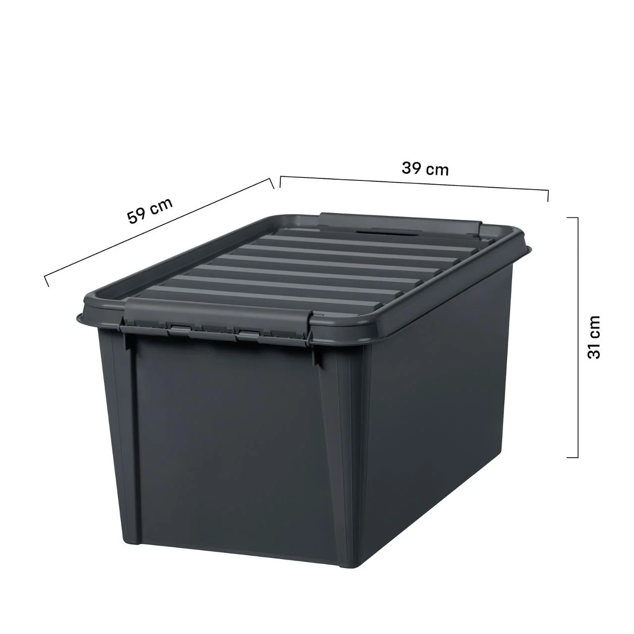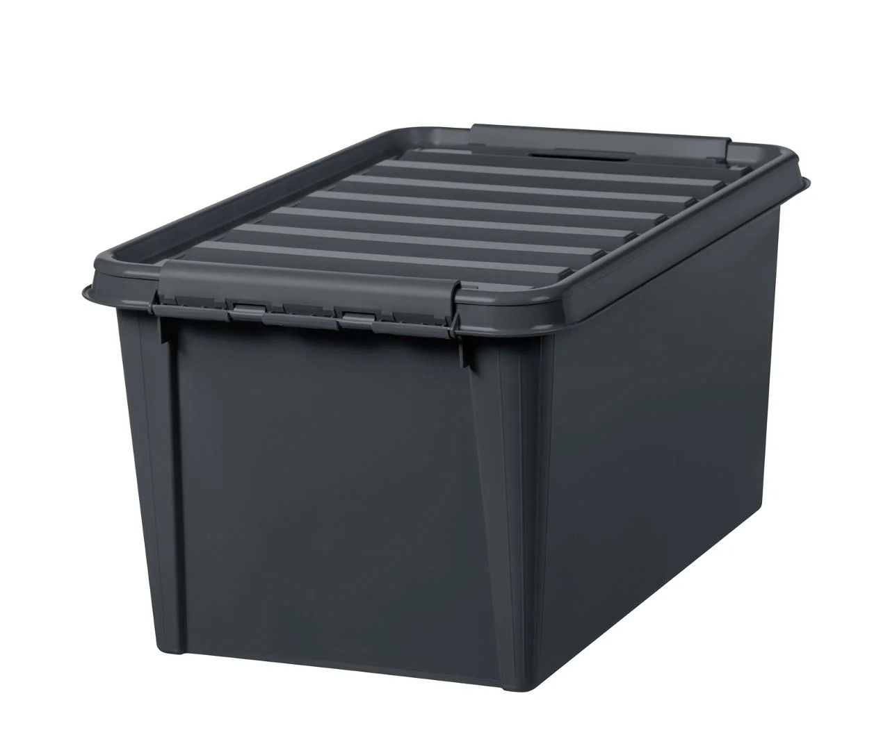 SmartStore™ Recycled-serien består av några av våra mest populära förvaringslådor tillverkade av återvunnen plast. Använd lådorna för att organisera förrådet, källaren eller garaget. Den här lådan rymmer 46 liter och är perfekt för att förvara skor, verktyg, friluftsutrustning, och träningsutrustning. Rejäla clips håller locket på plats. Lådorna kan staplas i varandra utan lock, och på varandra med lock. SmartStore™ Recycled 46 L är stapelbar med storlek 66 L. Tillverkad i Sverige av hållbar, återvunnen plast. 10 års garanti.