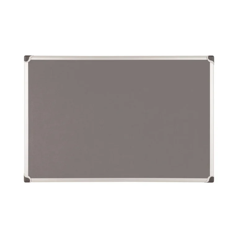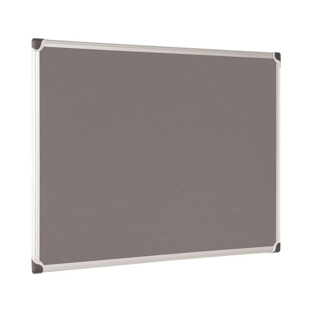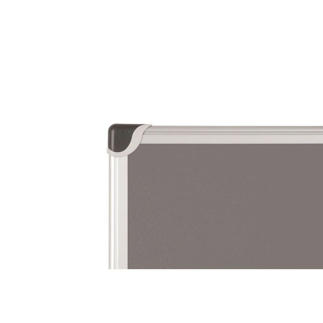 Oppslagstavle i grå filt med ramme av børstet aluminium og ABS plasthjørner.