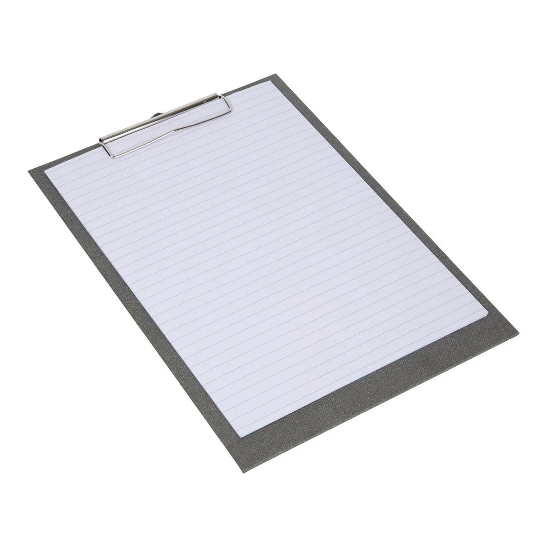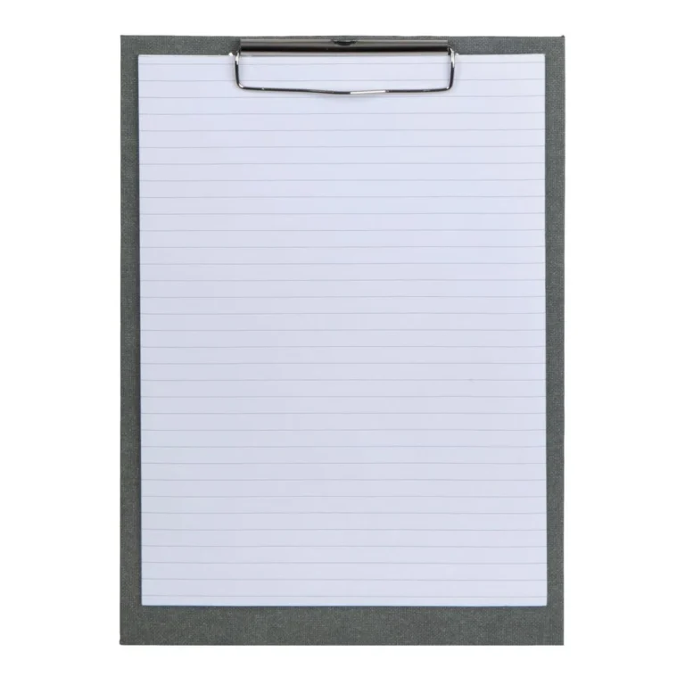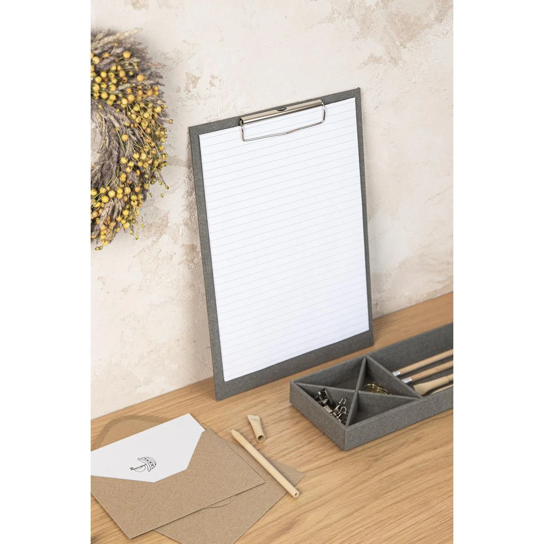 Metallklypen sikrer at papirene holder seg på plass. Leveres med 15 ark linjert papir.