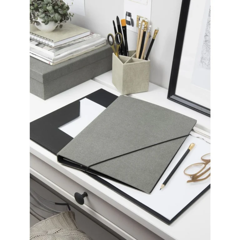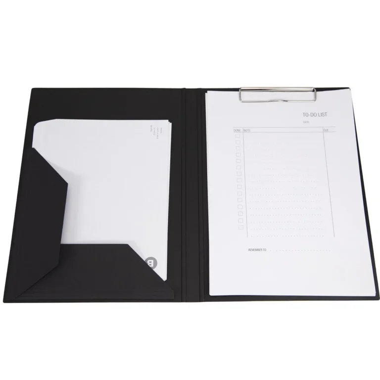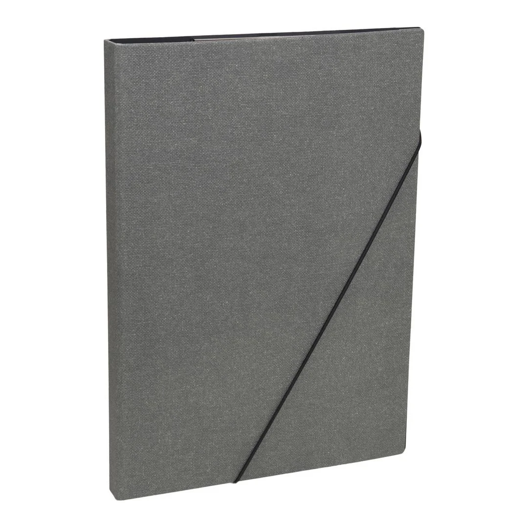 Metallklypen inni sikrer at papirene holder seg på plass, og strikken holder mappen lukket.