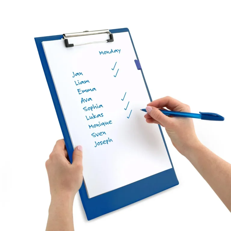 Ordrebrett i PVC med forsterkede hjørner Ekstra solid klype som tar mange ark og er behagelig i bruk For A4 ark Hendig holder for penn/blyant.