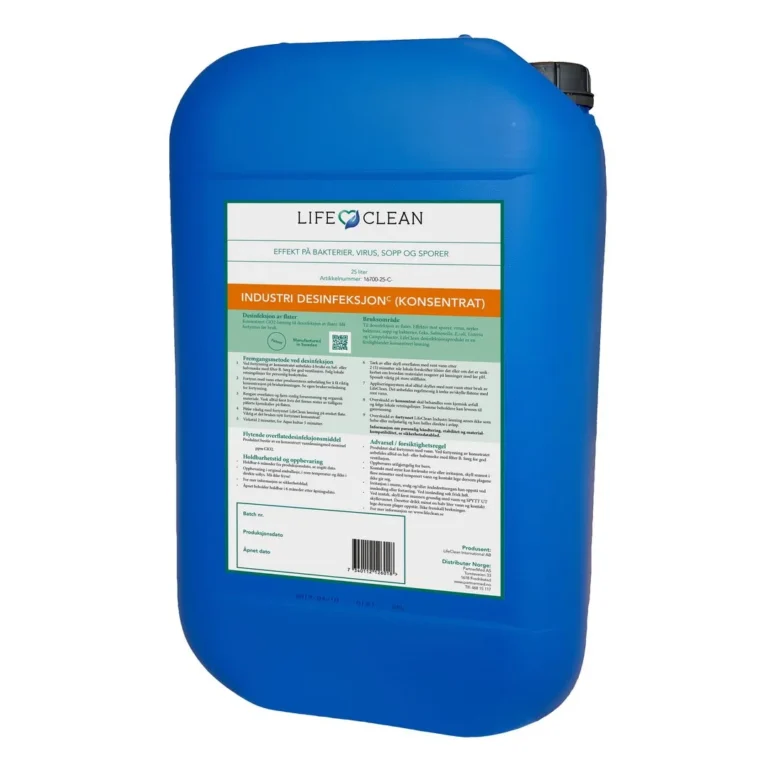 LifeClean er et desinfeksjonsmiddel til overflater og utstyr. Konsentrert C1O2-løsning,må fortynnes før bruk. LifeClean har godkjenninger som kreves til næringsmiddelindustrien og har en overlegen effekt og virketid.