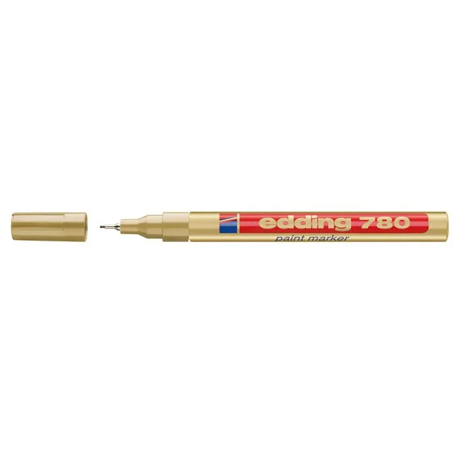 Edding 780-paint marker, permanent merkepenn har en tett lakkferniss og skriver jevnt på flere forskjellige overflater. Denne permanente merkepennen benytter hurtigtørkende blekk og er vann- og flekkbestandig, slik at du kan skrive tydelige og plettfrie linjer. Edding 780-merkepennenen har metallramme og en ekstra fin kulespiss med en strekbredde på 0,8 mm og passer utmerket til oppgaver som krever presis og nøyaktig skriving. Den kan skrive på nesten alle slags overflater og det spesielle blekket inneholder verken toluen eller xylen, noe som betyr at merkepennen ikke avgir ubehagelig lukt.