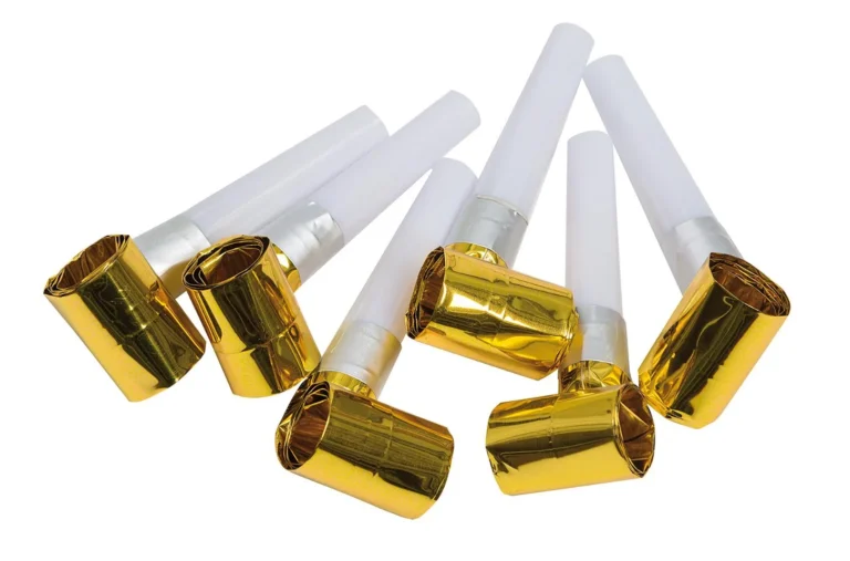 Festlige blå horn i glitrende gull – et klassisk element som sprer glede og lyd ved hver feiring. Pakken inneholder 6 stk.