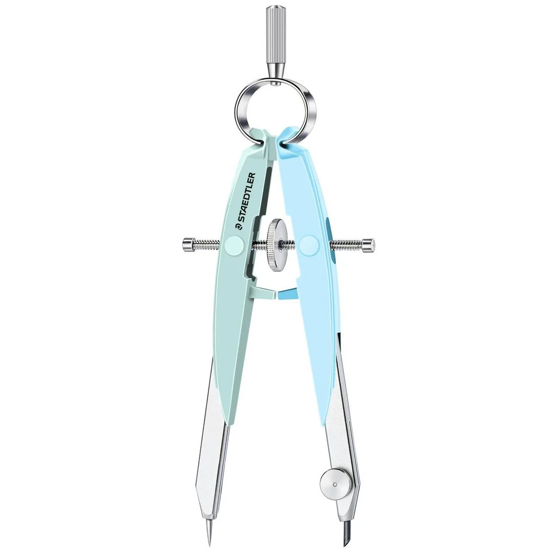 Mars® comfort 556 Precisions geometri passer. Flott pastell farge i blå/grønn. Senterhjul for hurtig og presis innstilling av radius. Diameter opp til Ø 225 mm. Lengde 154 mm. Robust passer produsert i metall og plast. Utskiftbar nål. Settet inneholder passer og ekstra reservedelsboks.