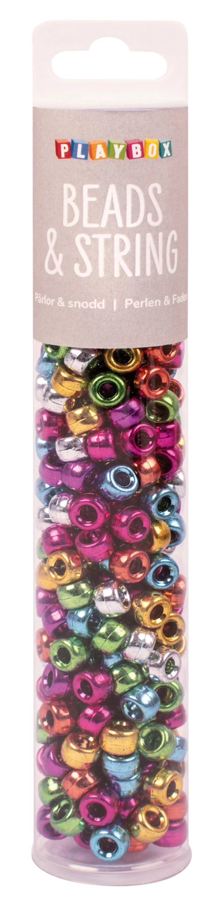 Herlige metallicfarvet kongoperler og elastikk. – Mål: Ø9mm, hullstr. 3,8mm – 7 farger