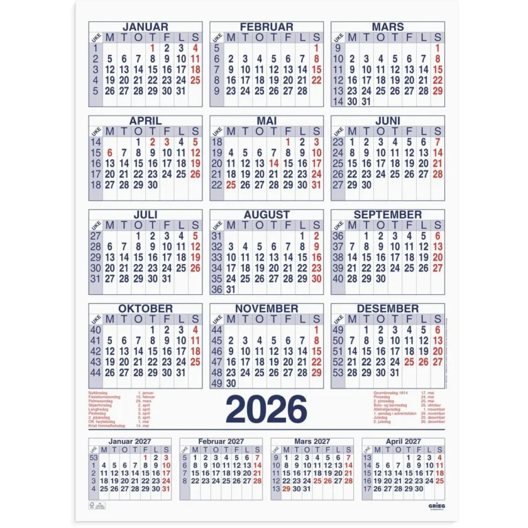 Her har du oversikt fra januar og til april året etter (16 måneder). Kalenderen har metallskinne oppe og nede slik at den henger fint på veggen. Dette er det ultimate verktøyet for planlegging av ferie, leveranser som går over forskjellige uker, skiftarbeid eller annet som krever full oversikt. Oversikt over helligdager. Kalenderen leveres i hylse. Opphengshull gjør den enkel å henge på veggen. Kalenderen er miljømerket FSC®, som betyr at hele produktet er produsert med papir og annet trevirke fra et ansvarlig og bærekraftig skogsbruk.