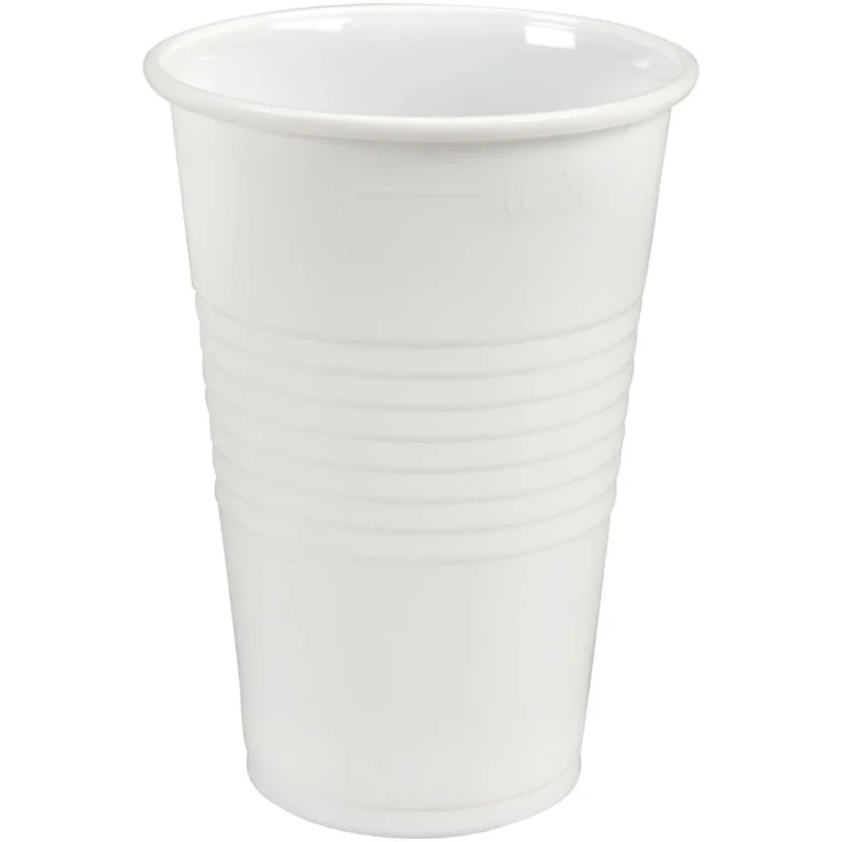 Hvite antistatiske drikkebeger med riller, til alle typer matvarer. Begrene er laget av PP-plast, og går ikke lett i stykker.