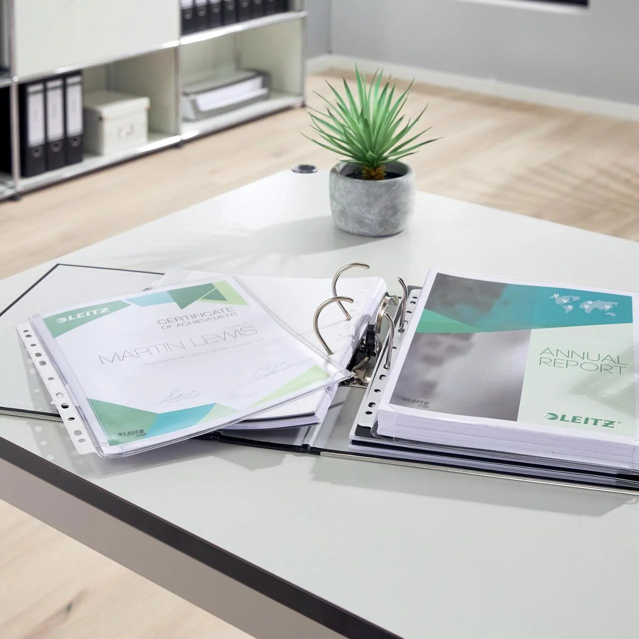 Universal hulling gjør at den passer inn i de fleste permer. Ekstra holdbar og kraftig plast-folie Holdbar med rivebeskyttelse Toppåpning Universalhulling Copysafe Syrefri.
