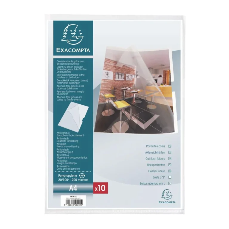 - Exacompta plastlommer i A4-størrelse tilbyr enkel organisering og optimal beskyttelse av dokumentene dine. Produsert av stiv, 200 µ glassklar polypropylen, gir disse plastlommene en robust og transparent løsning for å holde dokumenter synlige og lett tilgjengelige. Med åpning på både topp og side samt tommelhull for enklere tilgang, er dette en ideell løsning for profesjonell og praktisk dokumentoppbevaring. Leveres i pakke med 10 lommer.