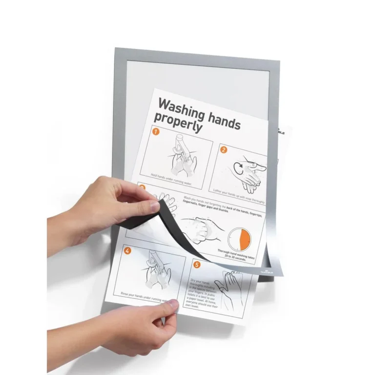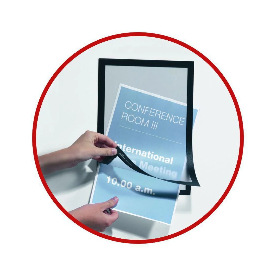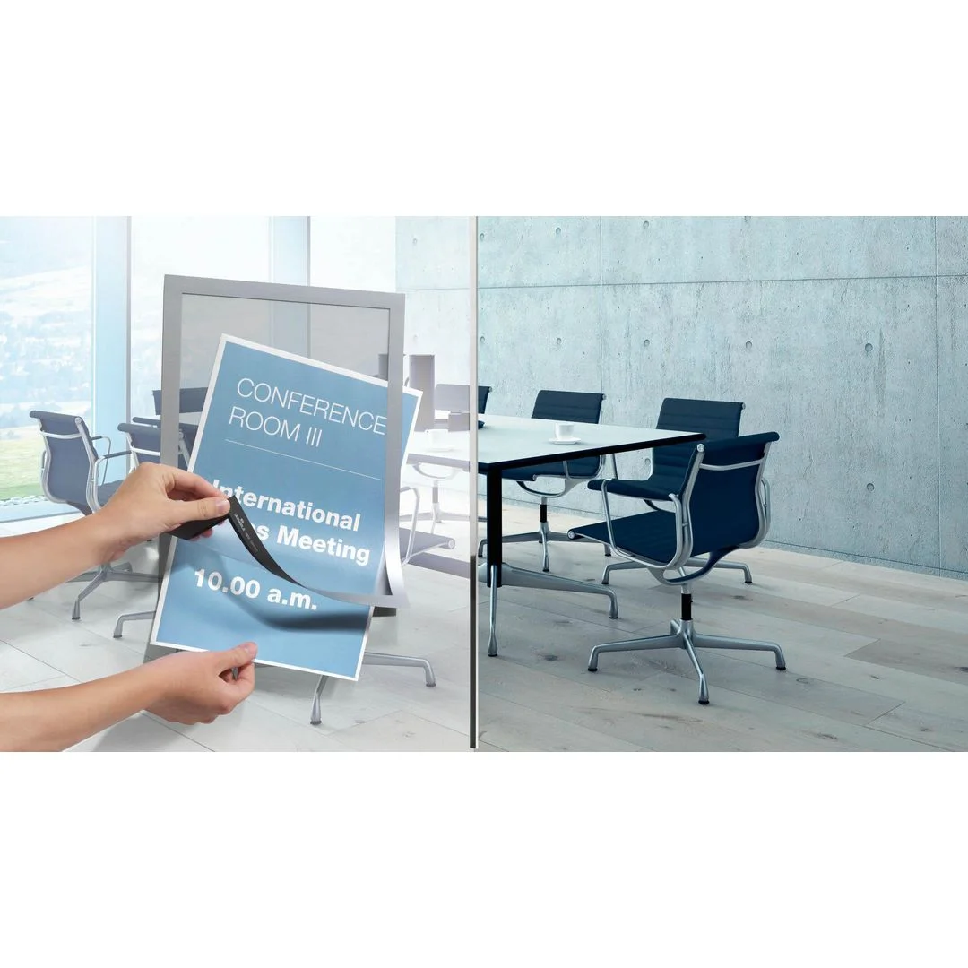 Selvklebende posterramme med magnetisk forside for bruk på glass og andra slette overflater. Den transparente fremsiden av plast med omramming med magnet, gjør det enkelt å bytte ut innholdet gang på gang.