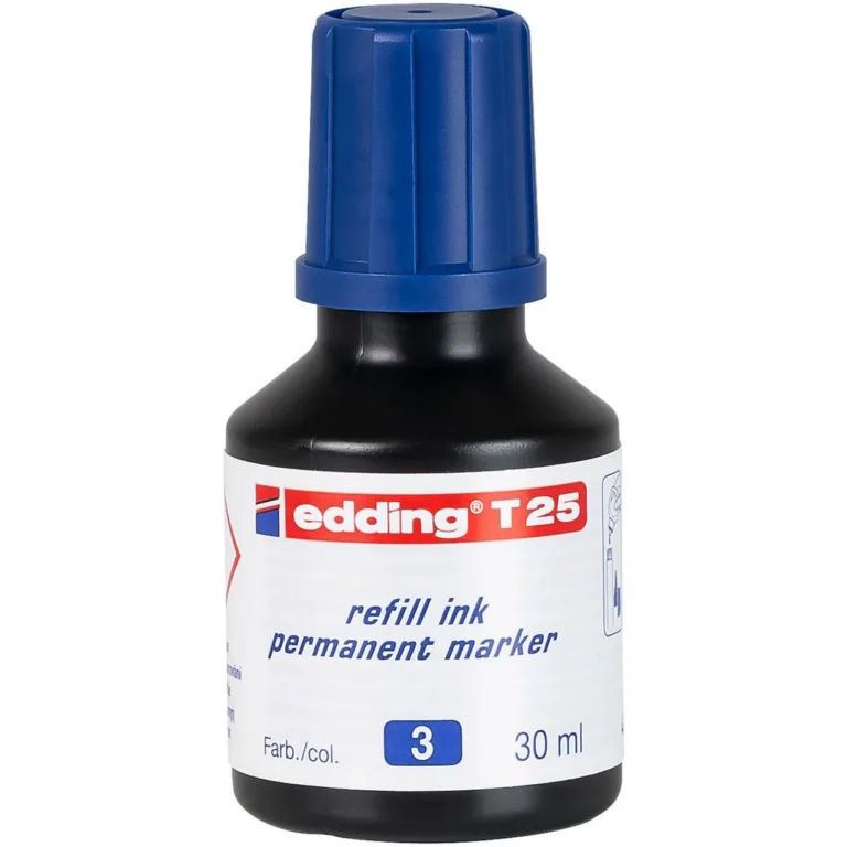 Få permanentmarkerne dine til å leve lengre med edding T25 refill-blekk – en smart, rask og økonomisk løsning for alle standard edding permanent markers. Den praktiske drop-dispenseren gir presise påføringer og fyller blekket på tett og effektivt, uten søl. Velg blant ti livlige farger slik at favorittmarkøren alltid er klar til bruk. Den hurtigtørkende, luktarme og vann- og lysekte formelen sikrer skarpe, smussbestandige merker som varer. – Refill blekk til merkepenn – Drop-dispenser for presis påfylling – Permanent, luktarm, vannfast, smussbestandig, lysbestandig – Volum: 30ml – Farge: Blå – For bruk med edding 1, 370, 390, 400, 500, 550, 800, 850, 2000C, 2200C, 3000, 3300 + EcoLine 21/22/27