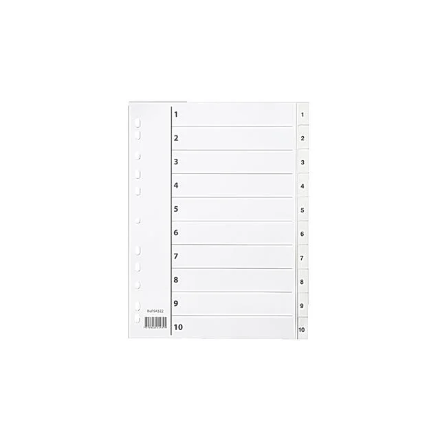 Skillearkene er utformet med forhåndstrykte etiketter, slik at du raskt kan identifisere og bla deg frem til materiellet i hver del. Den slitesterke plastkonstruksjonen tåler daglig slitasje og kan enkelt flyttes takket være de universelle perforeringene som fungerer med alle ringpermer eller arkiveringssystemer. Forhåndstrykte skilleark, merket 1-10 Slitesterk konstruksjon som tåler bruk og slitasje Universelle perforeringer gjør at de kan brukes med flere ringpermer og arkiveringssystemer.