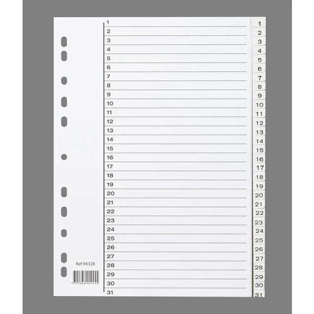 Skillearkene er utformet med forhåndstrykte etiketter, slik at du raskt kan identifisere og bla til materiell i enhver del. Den slitesterke plastkonstruksjonen tåler daglig slitasje og kan enkelt flyttes takket være de universelle perforeringene som fungerer med alle ringpermer eller arkiveringssystemer. Forhåndstrykte skilleark, merket 1–31 Slitesterk konstruksjon for å tåle bruk og slitasje Universelle perforeringer gjør at de kan brukes med flere ringpermer og arkiveringssystemer.
