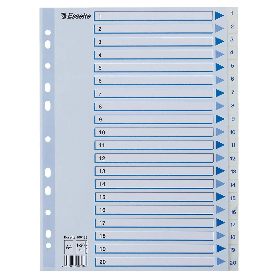 Esselte®-skilleark er utformet for effektiv organisering og arkivering av notatbøker, ringpermer og dokumenter. Esselte®-skillearkene er en ideell løsning for å administrere dine dokumenter og ringpermer.