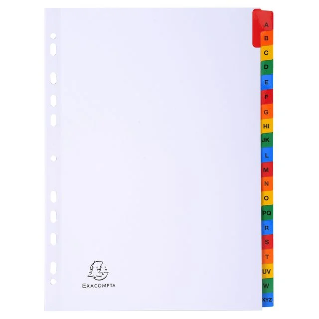 Exacompta A-Z register. Exacompta-indeksene er laget av 160gsm hvitt kort med fargede forsterkede plastfliker. Indeksene er A4 i størrelse og er forhåndstrykt med A til Å. Indeksene er forhåndsstanset slik at de kan settes inn i filer og mapper.