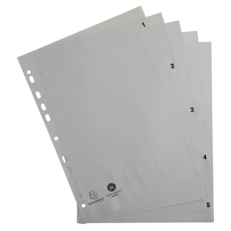 Exacompta skillearkene har universalhulling, slik at de passer til alle typer A4-ringpermer, og hjelper deg med å ordne mappene dine pent i seksjoner. Du kan bruke flikene til å raskt få tilgang til innholdet. Disse skillearkene er laget av 1,2 mm grå PP plast.
