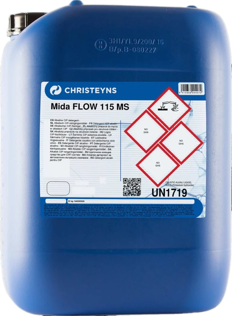 Mida Flow 115 MS er et flytende lavskummende vaskemiddel spesielt for bruk i rengjøringskretser og mekaniske vaskeinstallasjoner i næringsmiddelindustrien.