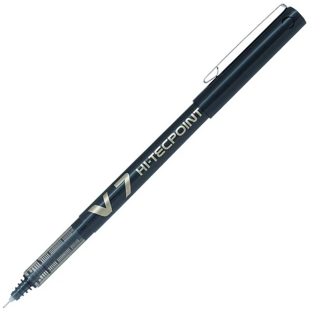 Pilot Hi-Tecpoint V7-pennen er en kulepenn med middels spiss med en blekkregulator som sikrer jevn blekkflyt Denne kulepennen med flytende blekk leveres med en spiss av rustfritt stål som gir jevne og nøyaktige streker uten problemer Arkivbestandig blekk i henhold til ISO- 14145-2 Den robuste kulen i wolframkarbid beholder formen over tid og har fordypninger for ekstra støtte og en jevn rotasjon Pennen er påfyllbar og leveres med lokk og lommeklips for ekstra beskyttelse Kulepenn med flytende blekk Kule i wolframkarbid Utstyrt med en blekkregulator for konsekvent blekkflyt.