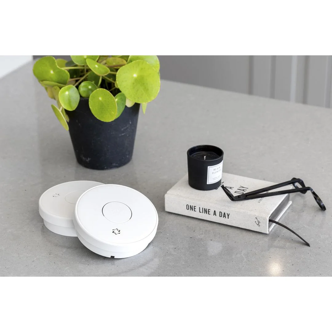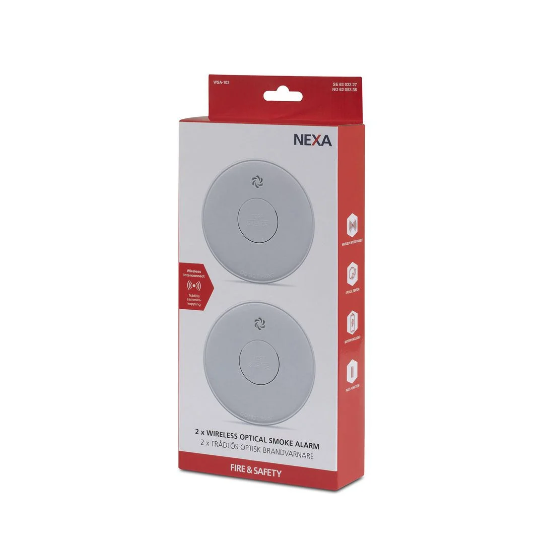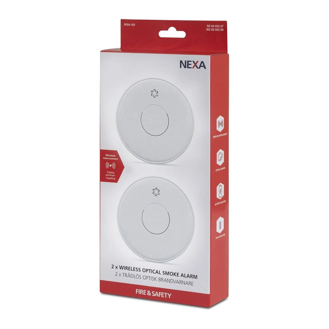 To trådløse røykvarslere med kobling. Oppdager raskt saktebrennende branner. Leveres med plugger og skruer for montering.