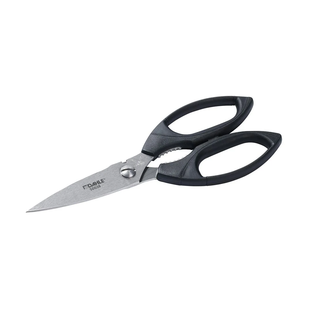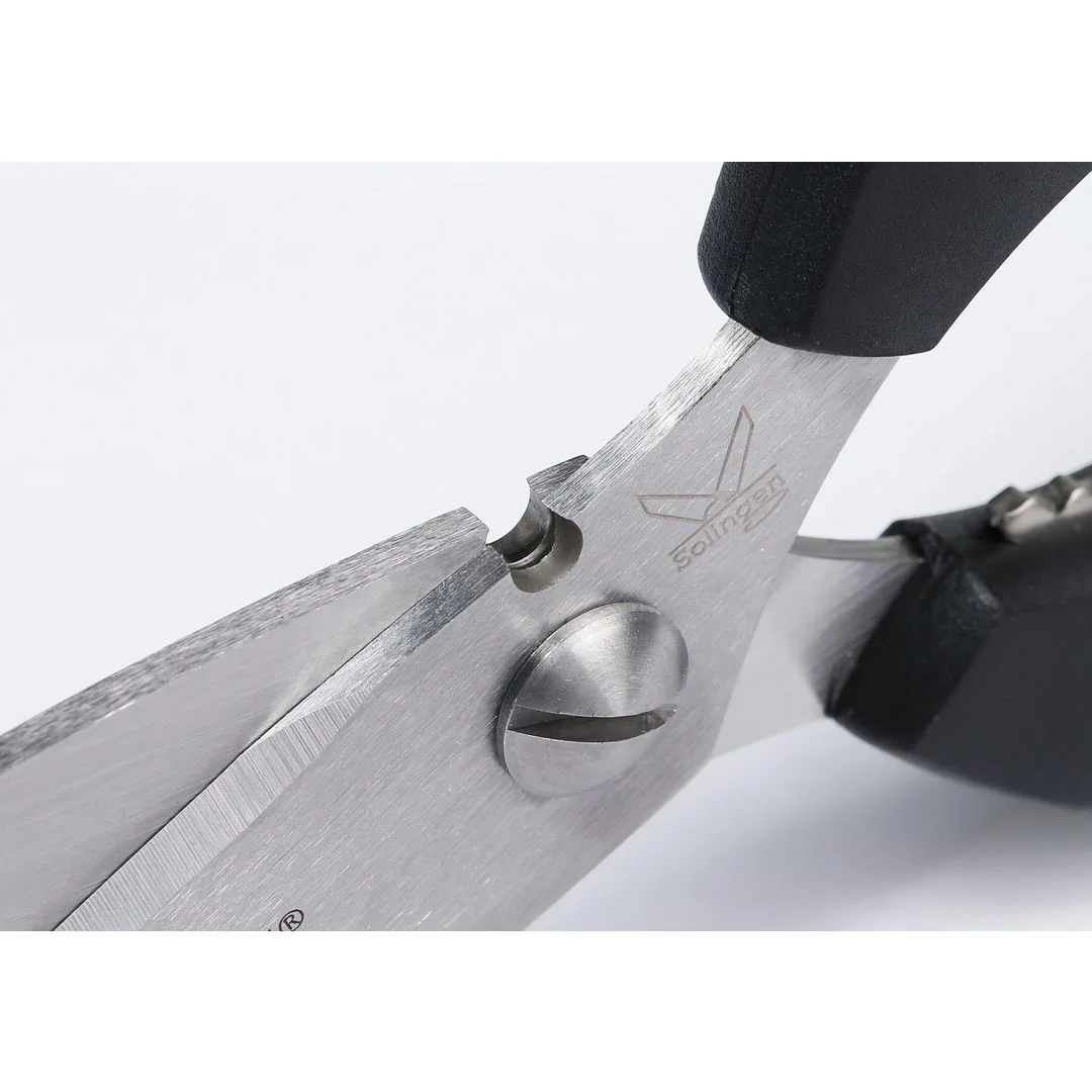 Profesjonell saks med presisjonsslipte kniver i rustfritt stål av høy kvalitet. Tåler oppvaskmaskin. – Krukkeåpner integrert i håndtaket. – 54 Rockwell, herdet rustfritt stål. – Presis klipping – Lengde: 21 cm. – Farge: sort.