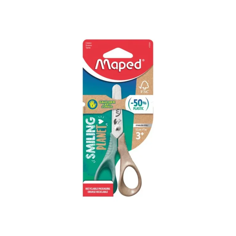Saksens rustfrie stålblader sikrer en høy kvalitet som ikke sløves over tid, og de er designet for å tåle mange års skolebruk. Laget med 50% trefiber, reduserer Vivo Smiling Planet saksens ringer plastbruken med 50%. Den fullt resirkulerbare pappemballasjen underbygger produktets bærekraftighet. Passer for barn fra 3 år og oppover. Ergonomiske 3D-ringer for små venstrehender Omvendte blader for enklere læring for venstrehendte Runde tuppblader for økt sikkerhet Rustfrie stålblader som ikke sløves over tid Laget med 50% trefiber Reduserer plastbruken med 50% Fullt resirkulerbar pappemballasje Egnet for barn fra 3 år.