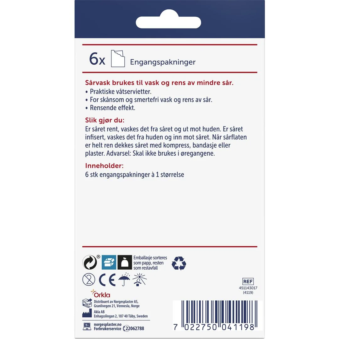 Praktiske våtservietter til rengjøring av sår. Har en rensende effekt med klorhexidin. Produktet skal ikke brukes i eller på ørene. Sårvasken kommer i en pakke på seks våtservietter. Våtserviettene er pakket enkeltvis. De er fine å ha i medisinskrinet både i hjemmet, på reise og på idrettsarrangementer.
