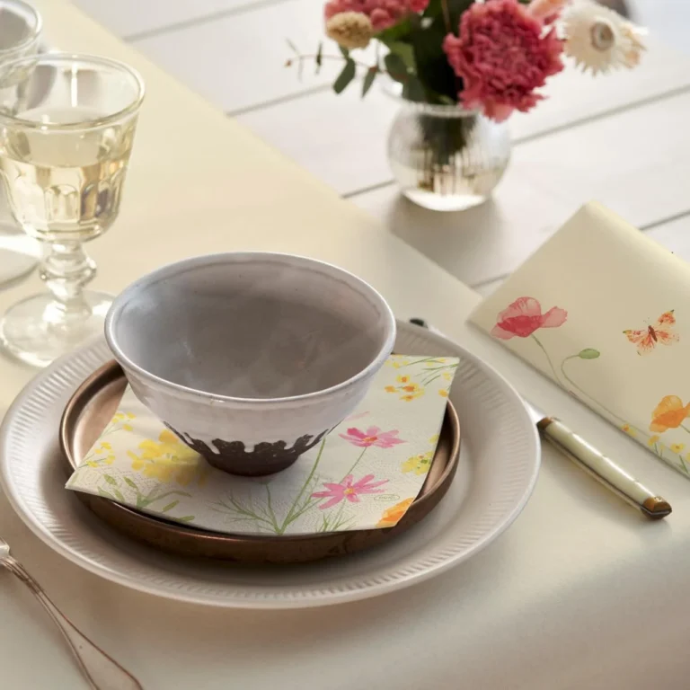 Store middagsservietter, sjarmerende og dekorative med blomsterengmotiv på vaniljefarget bakgrunn. Deilig myke til fargerike stunder.