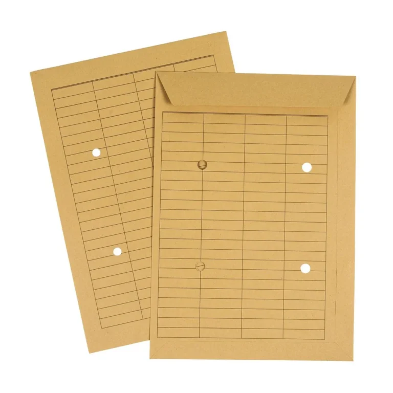 Posen er åpen i kortsiden og har fortrykte rader for notering.