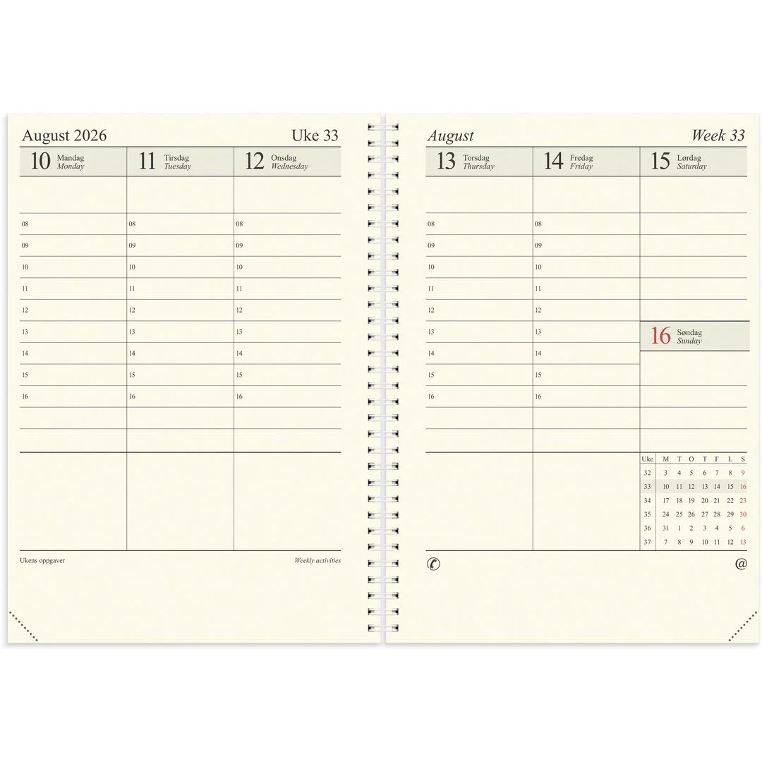 Hold ordene på planer og møter med denne spiraliserte sjefskalenderen Kalenderen er en del av en større serie med Sjefskalendere. Felles for disse er at de har eksklusivt kremfarget papir, både norsk og engelsk kalendarium, utstanset månedsregister, hjørneperforering og hele uken i oppslag med stående kolonner. Den inneholder kalendariske opplysninger, telefonguide, månedsoversikt, årsoversikt, månefaser, helligdager og kongelige fødselsdager. – Spiralisert sjefsjalender – Følger kalenderåret – Kartongomslag og kremfarget papir – Stående uke/oppslag – Timeinndeling 8-16 mandag til fredag – Månedsplaner og årsoversikt for inneværende og kommende år – Månefaser, helligdager og kongelige fødselsdager – Hjørneperforering – Antall sider: 128 – Papirvekt: 100g – Format: 190x270mm