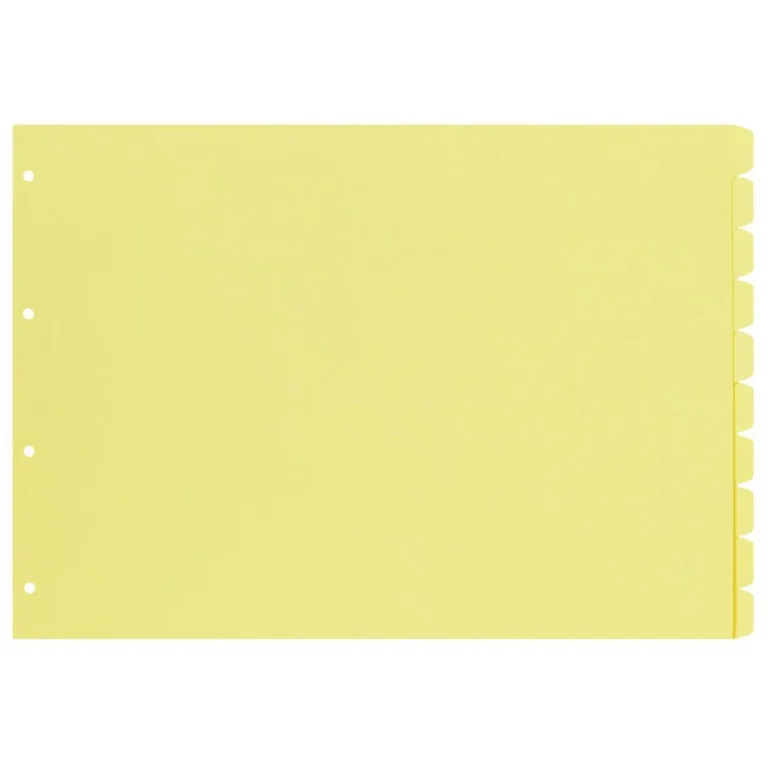 Disse skillearkene er laget av papp og leveres i fargen chamois. Innbindingen er hullet, slik at du enkelt kan organisere papirene dine ved hjelp av en perm eller en mappe. Delt inn i 10 deler Med 4 hull for å passe inn i ringpermer og notatbøker.