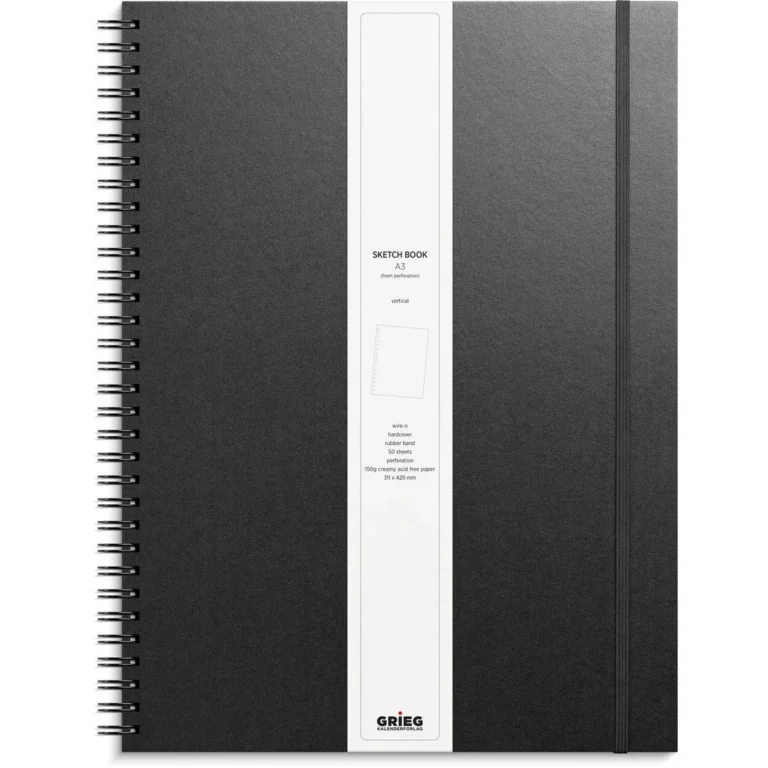 Det solide coveret og strikk som samler omslagene gjør at boken tåler mye og tegningene ivaretas. Kunstskinn harcover omslag Spiralisert rygg Strikk for lukking Perforert livekant på arkene 15g kremfarget papir Syrefritt papir 50 blad, 100 sider.